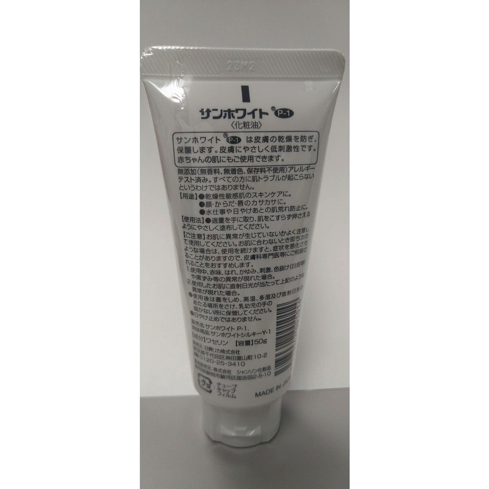 サンホワイトP‐1は高品質のワセリンです。 乾燥性敏感肌(ドライスキン)のスキンケアとしてご使用ください。 乾燥を防ぎさまざまな外的刺激からやさしくお肌を保護します。 乳幼児からお年寄りまでご使用できます。 顔、からだのスキンケア、目の周りや唇の乾燥に、赤ちゃんのオムツかぶれ、日焼けあとのスキンケアなどにご使用できます。 50gチューブ品は持ち運びにも便利なサイズです。 適量を手に取りやさしく押さえるように塗布してください。