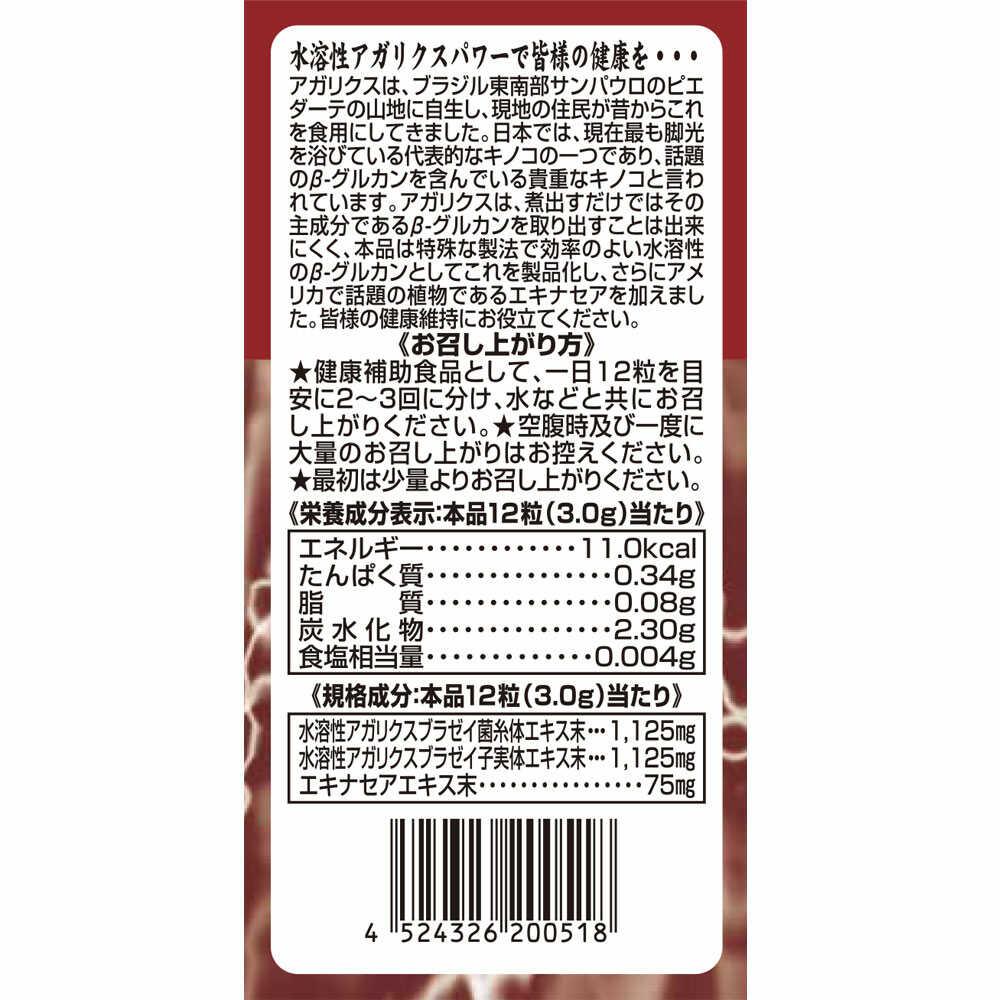 【本品12粒中】 アガリクスブラゼイ菌糸体エキス末、アガリクスブラゼイ子実体エキス末(アガリクスブラゼイ子実体エキス、デキストリン)、乳糖、エキナセアエキス末