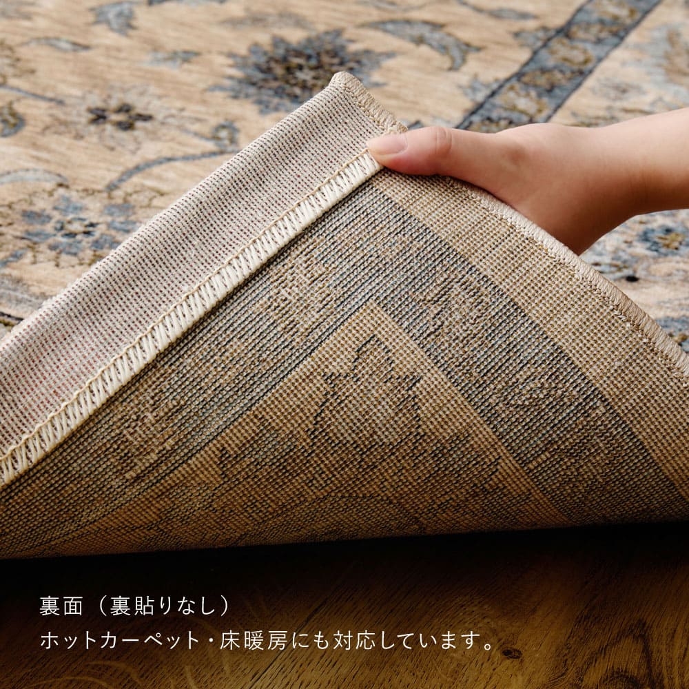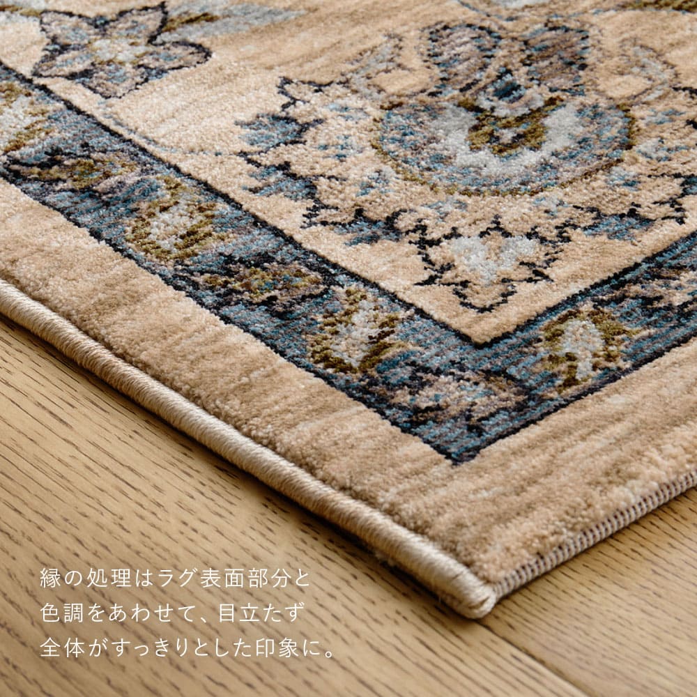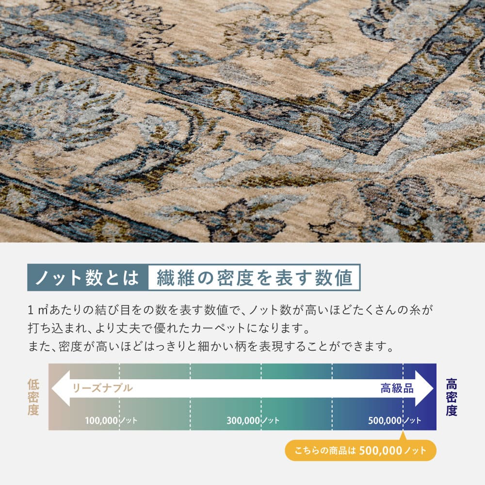 格式高い伝統柄と深みのある色合い、クラシカルなペルシャ調デザインをベースに、繊細な花柄モチーフを緻密に織り上たウィルトンラグ。 500,000ノットの高密度なパイルは、短めの毛足ながらもしっかりとした厚みを感じられ、踏み心地の良さや長く使える耐久性も魅力です。床暖房やホットカーペットとの併用も可能で、冬は暖かく夏も快適に。 気品あるデザインと高い実用性を兼ね備えたこのラグで、お部屋にワンランク上のインテリアコーディネートを取り入れてみませんか。