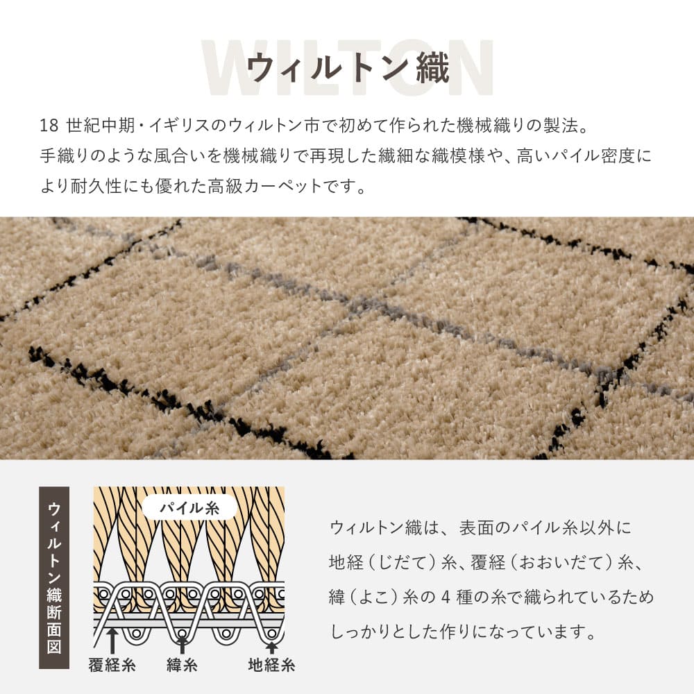 ヒートセット加工により、なめらかな触感と遊び毛の出にくさにも配慮。ホットカーペット・床暖房対応で、季節を問わず一年を通して使用できます。落ち着いたデザインはワンルームからリビングまで取り入れやすく、ソファ前やベッドサイドなど、日常のさまざまなシーンで活躍するウィルトンラグです。