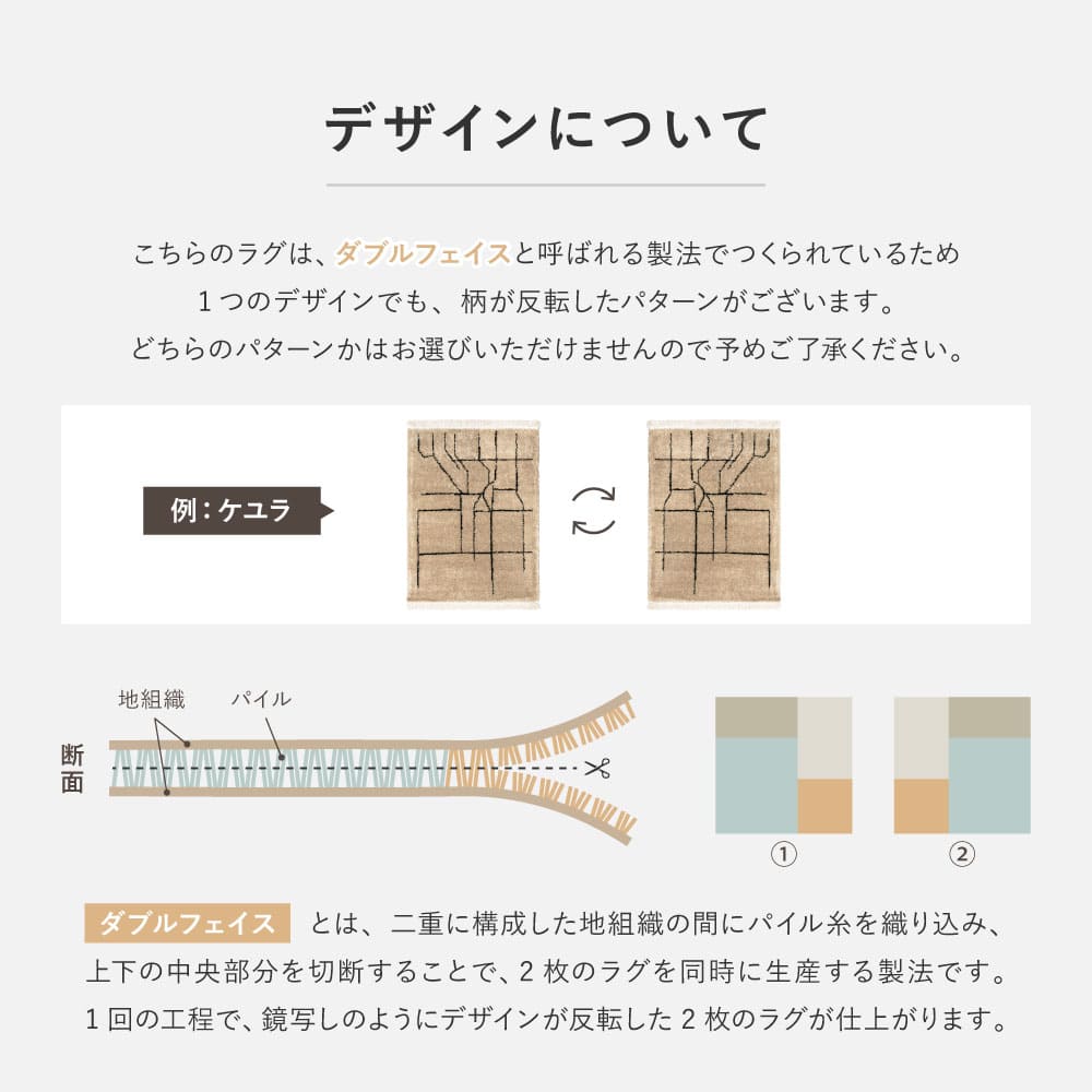 ダブルフェイス製法のため、デザイン画像と反転する場合がございます。柄の出方は指定できませんので、あらかじめご了承ください。また、毛足の流れや光の当たり方によって見え方が変わります。生産工程上、サイズにばらつきがございます。