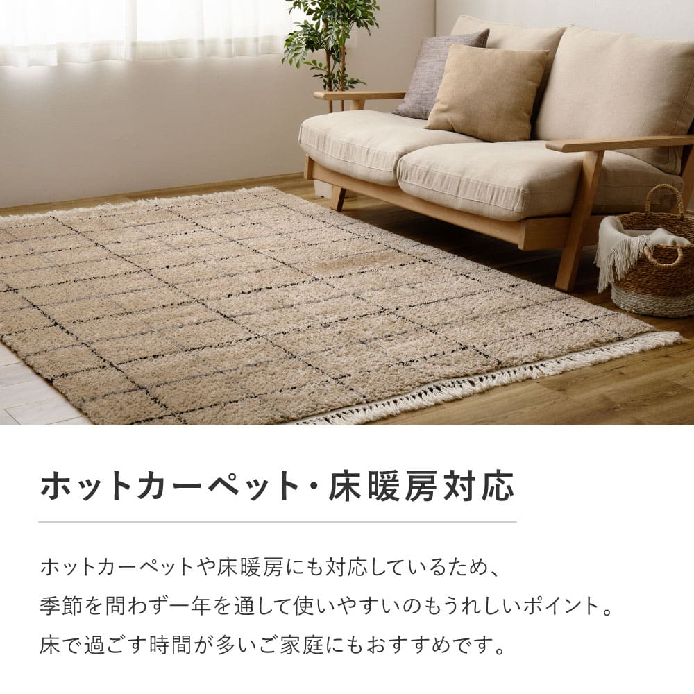 ヒートセット加工により、なめらかな触感と遊び毛の出にくさにも配慮。ホットカーペット・床暖房対応で、季節を問わず一年を通して使用できます。落ち着いたデザインはワンルームからリビングまで取り入れやすく、ソファ前やベッドサイドなど、日常のさまざまなシーンで活躍するウィルトンラグです。
