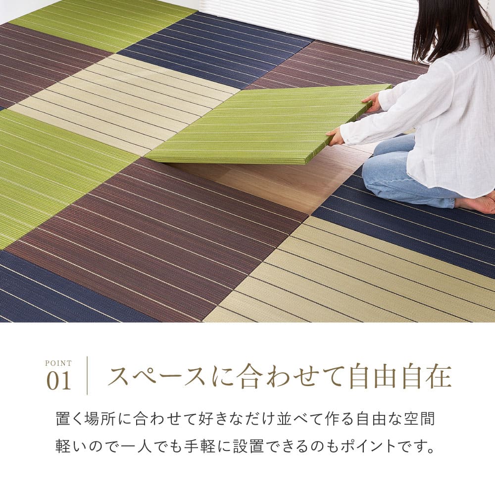 フローリングに置くだけで使える、い草素材の置き畳。軽量設計で一人でも扱いやすく、必要な枚数を並べるだけで空間に合わせたレイアウトが可能に。カットにも対応しているため、限られたスペースにも柔軟にフィットします。 い草ならではの吸湿性で夏はさらっと、断熱性により冬の冷気もやわらかく軽減。クッション性があり、足音や生活音の響きを抑えたい集合住宅の防音対策にも役立ちます。 ストライプ柄のデザインが空間に程よいアクセントを加え、リビングのくつろぎスペースやキッズスペース、ヨガや読書の時間にもおすすめ。ホルムアルデヒド試験をクリアしており、小さなお子さまやペットのいるご家庭でも安心して使える置き畳です。