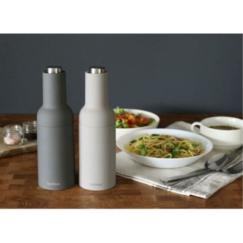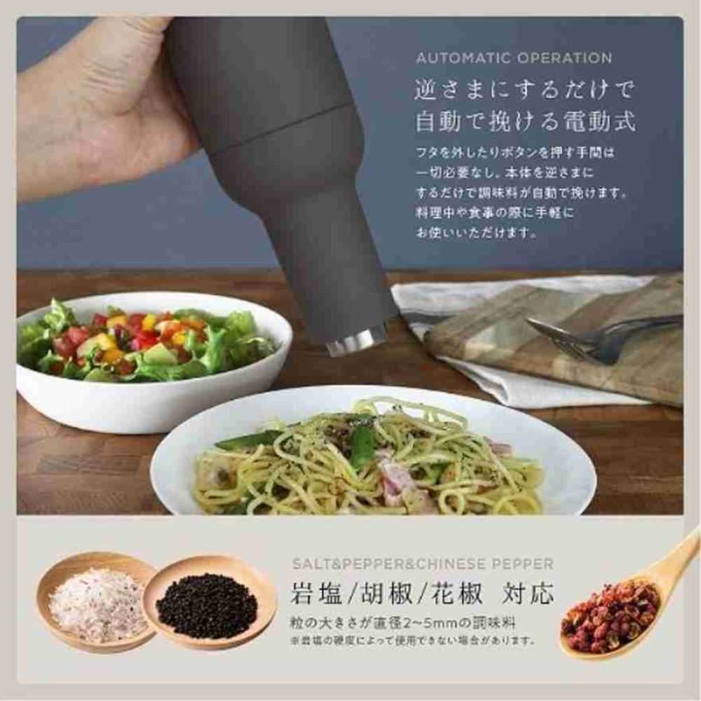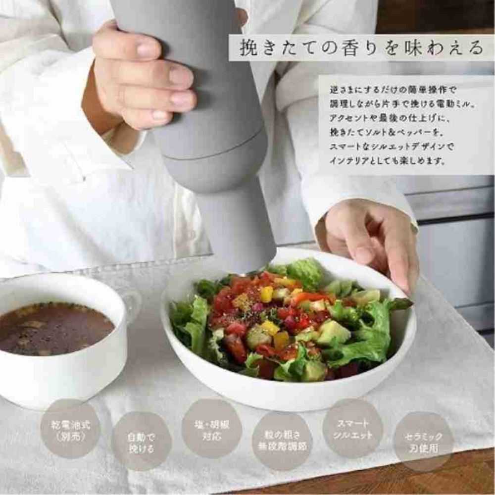 本体を逆さまにするだけで自動で挽ける電動ミル。フタを外したりボタンを押す動作は一切必要なし。料理中や食事の際に手軽にお使いいただけます。岩塩・胡椒・花椒に対応しており、粒の粗さを無段階で調節可能。アクセントや最後の仕上げに、炊き立てのソルト&ペッパーを。空間に馴染みやすいカラーリングと丸みを帯びたフォルムはダイニングにインテリアとして飾っておける商品です。