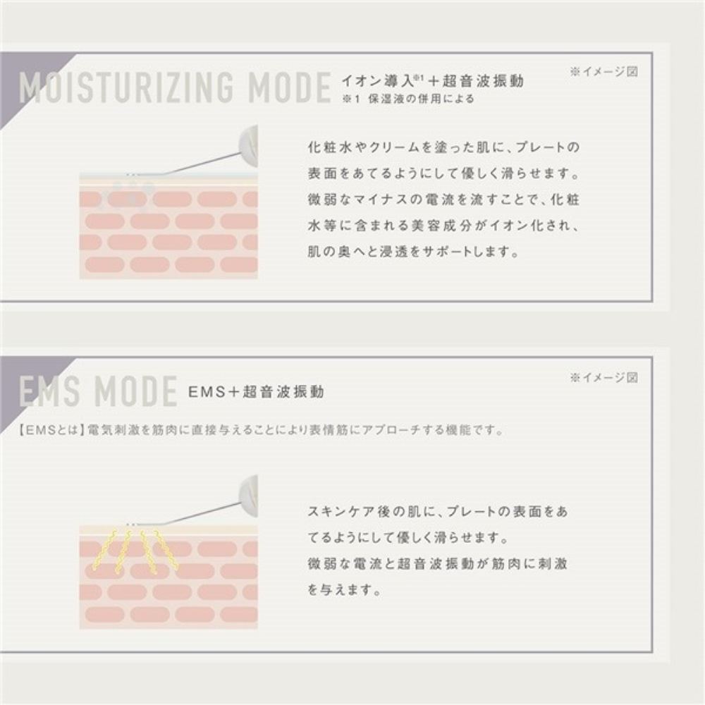 クレンジングや洗顔では落としきれなかった毛穴の汚れや古い角質を超音波振動で浮かせて除去します。また微弱な電波を流すことで保湿液の浸透をサポートする保湿モード、電気刺激を筋肉に直接与えることで表情金にアプローチするEMSモードも搭載。洗顔後の濡れた肌に超音波振動で汚れを浮かせて、クレンジングや洗顔では落としきれない毛穴に詰まった微細な汚れをイオンの力で優しく吸着し、吹き飛ばします。化粧水やクリームを塗った肌に、プレートの表面をあてるように優しく滑らせることで微弱なマイナスの電流を流し、化粧水等に含まれる美容成分がイオン化され肌の奥への浸透をサポートします。スキンケア後の肌にプレートの表面をあてることで微弱な電流と超音波振動が筋肉に刺激を与え表情筋にアプローチします。最大約30,000Hzの超音波振動が毛穴にダイレクトアプローチ。汚れや古い角質による黒ずみや皮脂の汚れを浮かせて除去します。電源を入れてから約10分が経過すると自動で電源がオフになり、過度な使用による肌への負担を減らします。