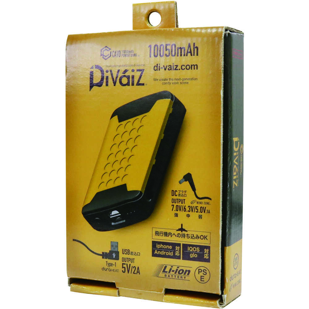 ●電熱インナーシリーズに使用できるオプションです。●USB差込/DC差込口を同時搭載。●年中使えるマルチモバイルバッテリー。●夏のファンウェア、冬の電熱ウェアのほかモバイルバッテリーとしても使用可能です。●両バッテリー共にUSBケーブル充電器セットで充電可能です。●バッテリー、充電器ともにPSEマーク取得しています。●CUC(株)社製のEFウェア用のファンにも対応●品名:マルチモバイルバッテリー10050mAh●適合機種:電熱インナーシリーズ●バッテリー使用時間:最大約13時間●充電時間:約6時間●出力(V):7.0/6.3/5.0●定格容量(mAh):10050●サイズH(mm):103●サイズW(mm):71●サイズD(mm):24●充放電回数(回):約300 質量260g