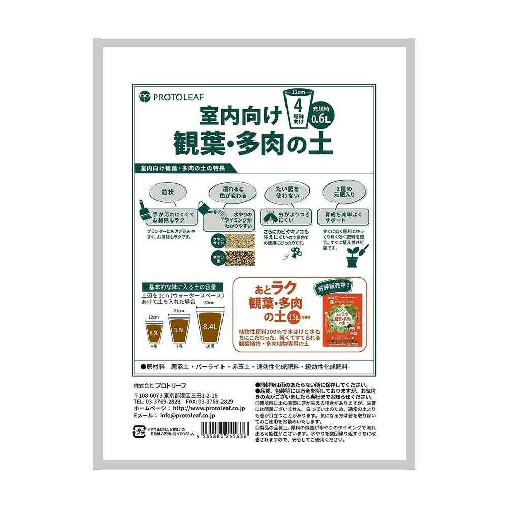室内での観葉植物と多肉植物の栽培におすすめ! 【特徴】 ・室内向け培養土(観葉・多肉植物専用) ・ph調整済み ・虫が寄り付きにくく、カビやキノコも生えにくい。 ・サラサラな粒状タイプの培養土 手が汚れにくく、お掃除もラクラク ・土の表面の色が変化することで、水やりのタイミングをお知らせします。 ・肥料に関して:速効性・緩効性の肥料配合で育成を効率よくサポート。