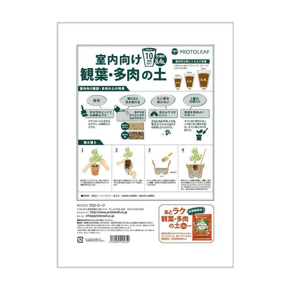 室内での観葉植物と多肉植物の栽培におすすめ! 【特徴】 ・室内向け培養土(観葉・多肉植物専用) ・ph調整済み ・虫が寄り付きにくく、カビやキノコも生えにくい。 ・サラサラな粒状タイプの培養土 手が汚れにくく、お掃除もラクラク ・土の表面の色が変化することで、水やりのタイミングをお知らせします。 ・肥料に関して:速効性・緩効性の肥料配合で育成を効率よくサポート。