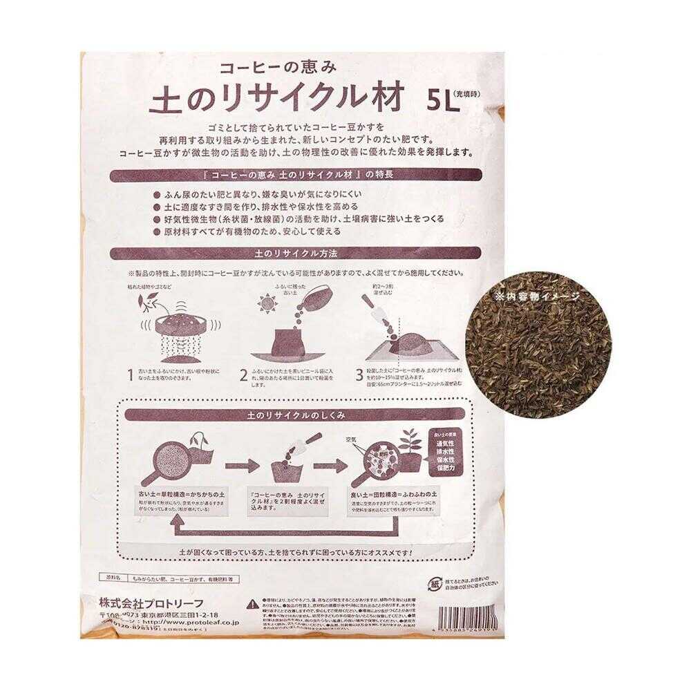 古い土をコーヒーかすの力で再利用! 【特徴】 ・年間約90万トン、ゴミとして捨てられているコーヒーかすが「古い土の再生材」として生まれ変わりました! ・軽くて清潔:動物性たい肥不使用、イヤなニオイが気になりにくい ・自然由来の原料使用:安心安全な有機原料100%の土のリサイクル材です。 ・もみがら配合で土をフカフカにします。 ・有機肥料配合で、様々な植物にお使いいただけます。