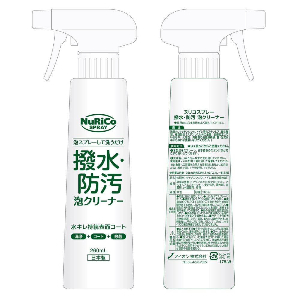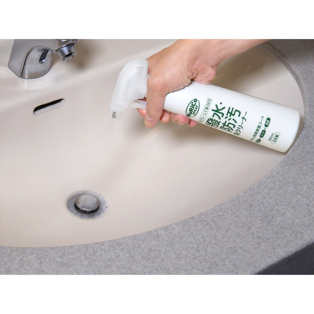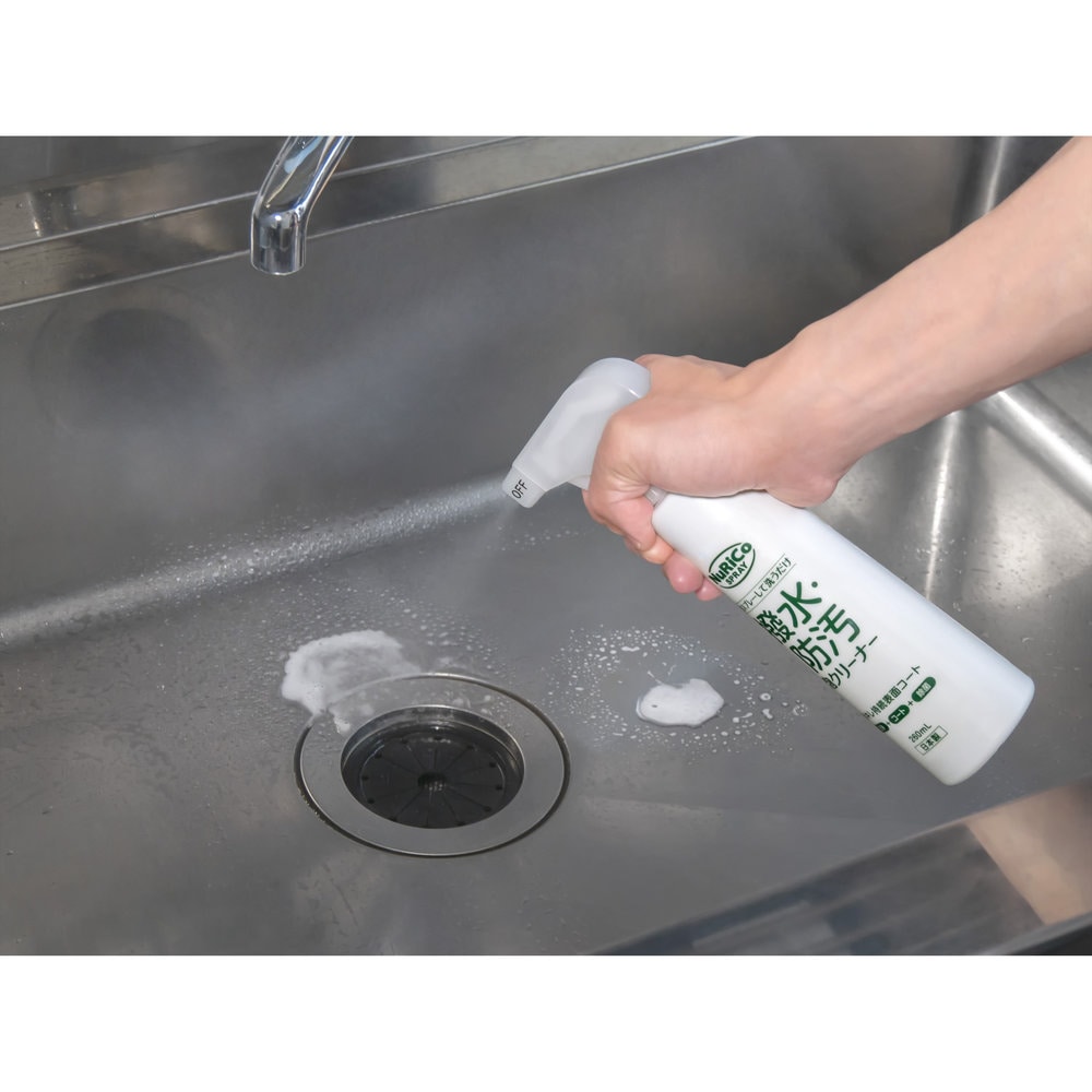 洗浄成分で汚れを落とすと同時に、コーティング効果で水と汚れの付着を防ぎ、日常のお掃除の回数と手間を減らすことができますヌリコスプレー 撥水・防汚 泡クリーナーは、週1回泡スプレーしてお手持ちのスポンジで擦るだけで、水回りの洗浄とコーティングが一度にできる商品です。洗面台、キッチンシンク、トイレ等のステンレス、衛生陶器、樹脂製品に使用できます。(ステンレス以外の金属、表面加工しているもの、大理石、陶磁器の金銀線模様、艶・光沢があるものについては使用しないでください。)【仕様】[使用量の目安]30cm四方に約1.5ml(スプレー約2回)[容量]260ml