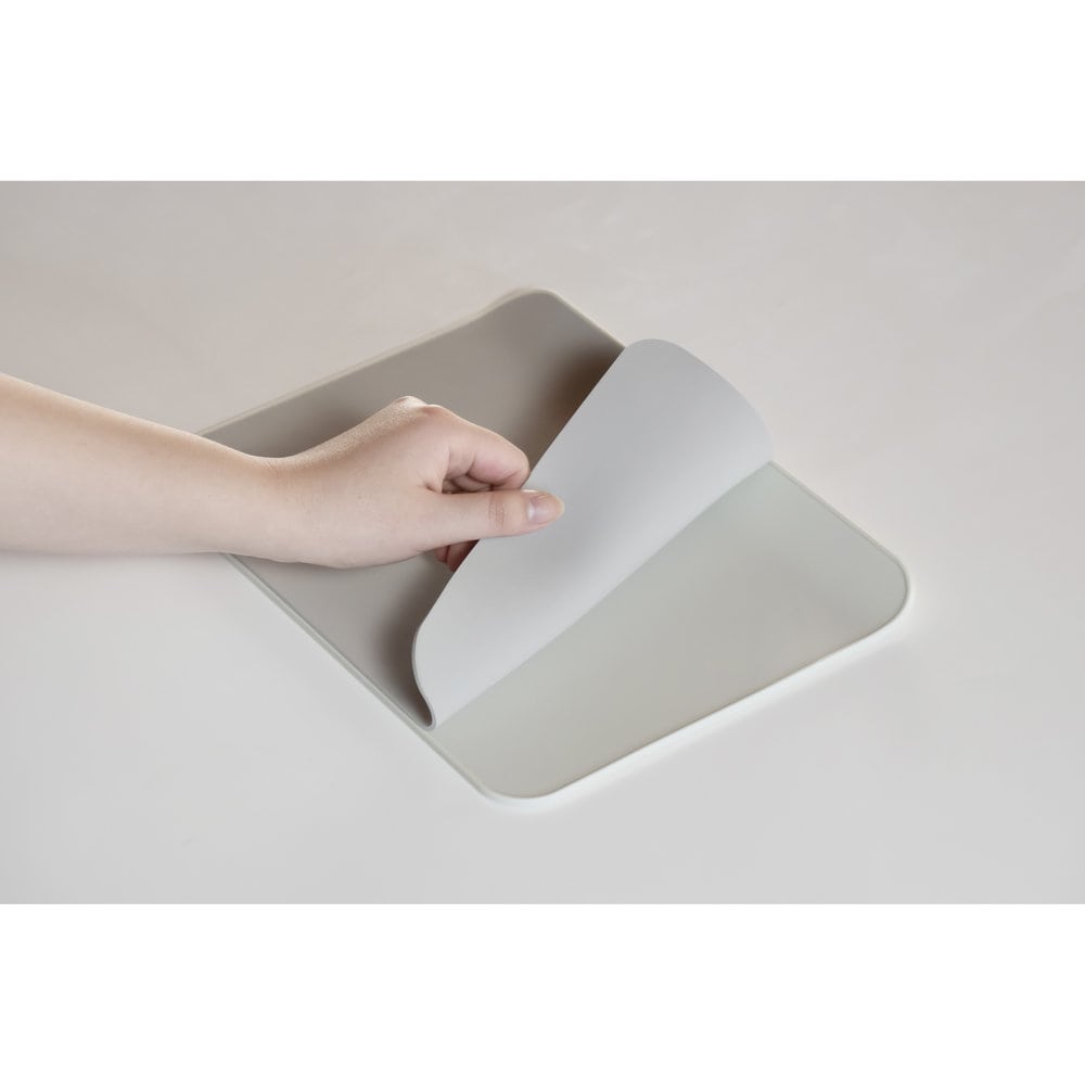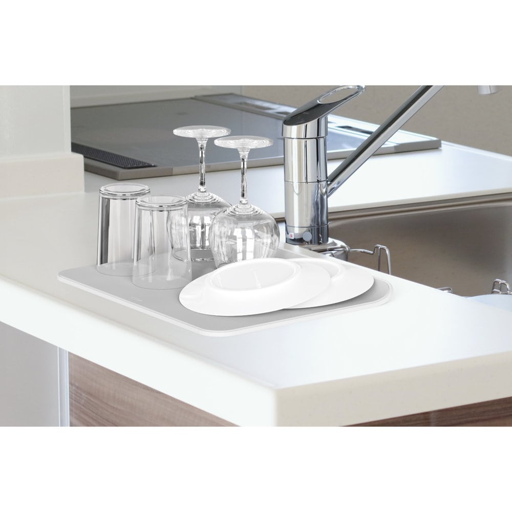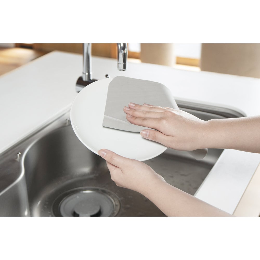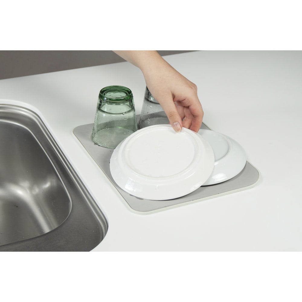マットは食器拭きにもなり、絞ることで吸水力が回復するので乾燥を待たずにくり返しご使用頂けます。手洗いができるためお手入れも簡単です。マットに使用している超吸水スポンジは珪藻土素材をしのぐほどの吸水力で食器などを素早く乾燥させます。柔らかくクッション性があるので落としても割れることがなく、食器などを傷つける心配もありません。絞るとすぐに吸水力が戻るのがこの特殊スポンジの特量です。乾燥を待つことなく、何度でも吸水可能です。シリコーンマットに角度をつけ、通気性を高めたことで、置いた食器やコップが早く乾きます。スポンジシートは、手洗い可能です。中性洗剤も使用できるため、清潔に保つことができます。スポンジシートは簡単に取外し可能。クロスとして、濡れた調理台や洗面所を拭くこともできます。