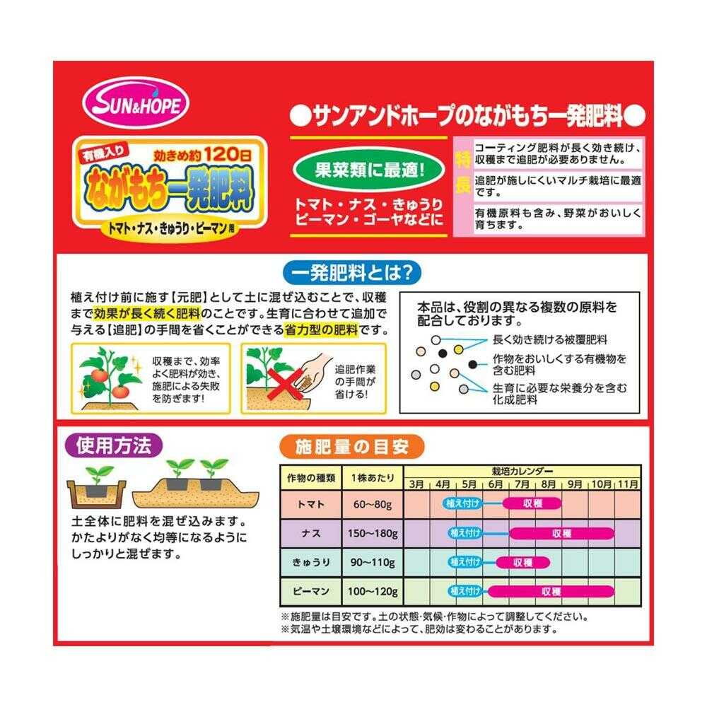 収穫まで長く効き続ける肥料 植え付け前に土全体に混ぜ込むことで肥料が長く効き続け、追肥の手間を省くことができる『一発肥料』が、果菜類用に商品化されました! 『追肥の手間を省き作業効率を高めたい!』『追肥による失敗を防ぎたい!』などプロから初心者まで、皆さんにとって使いやすい商品となっております。