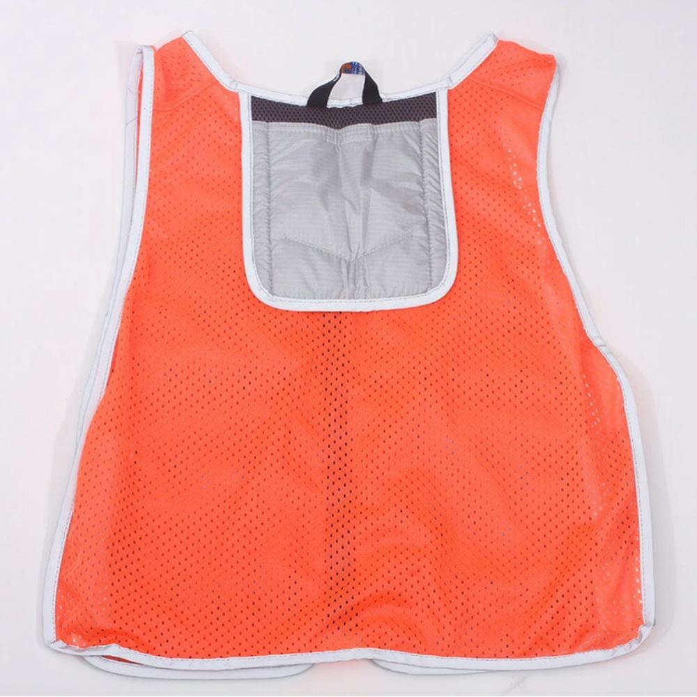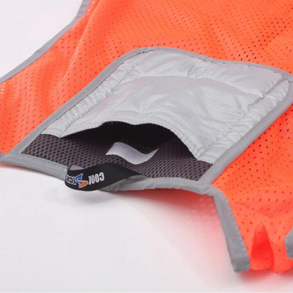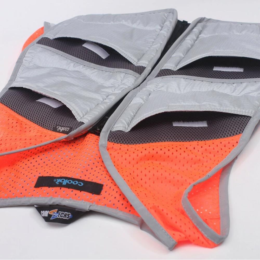 冷却ベスト coolbit アイスポケットベスト 5ポケットタイプ 熱中症対策アイスポケットベストの高視認タイプ。反射テープ付き。冷却効果10C以上。持続時間3時間以上。人体を車の構造に例えると、腹部は熱源となり体温を上昇させます。背中は暑さ寒さを司る「風寒のツボ」があり、人体のセンサーでもあります。大胸筋や背筋は汗をかき、放熱し体温を下げようと作用するラジエターと同じ構造です。アイスポケットベストは発熱部分の腹部と熱を感じとる背中を直接、効率よく冷やし、体温を下げるために発汗する胸と背筋の通気性を確保するためにメッシュ構造となっています。前面に4箇所、背中に1箇所ポケットを有し、その日の気温により、水・保冷剤・氷を使い分け、又は併用することにより、冷涼感を高めます。背中部分をメッシュ構造にして通気性をアップ。