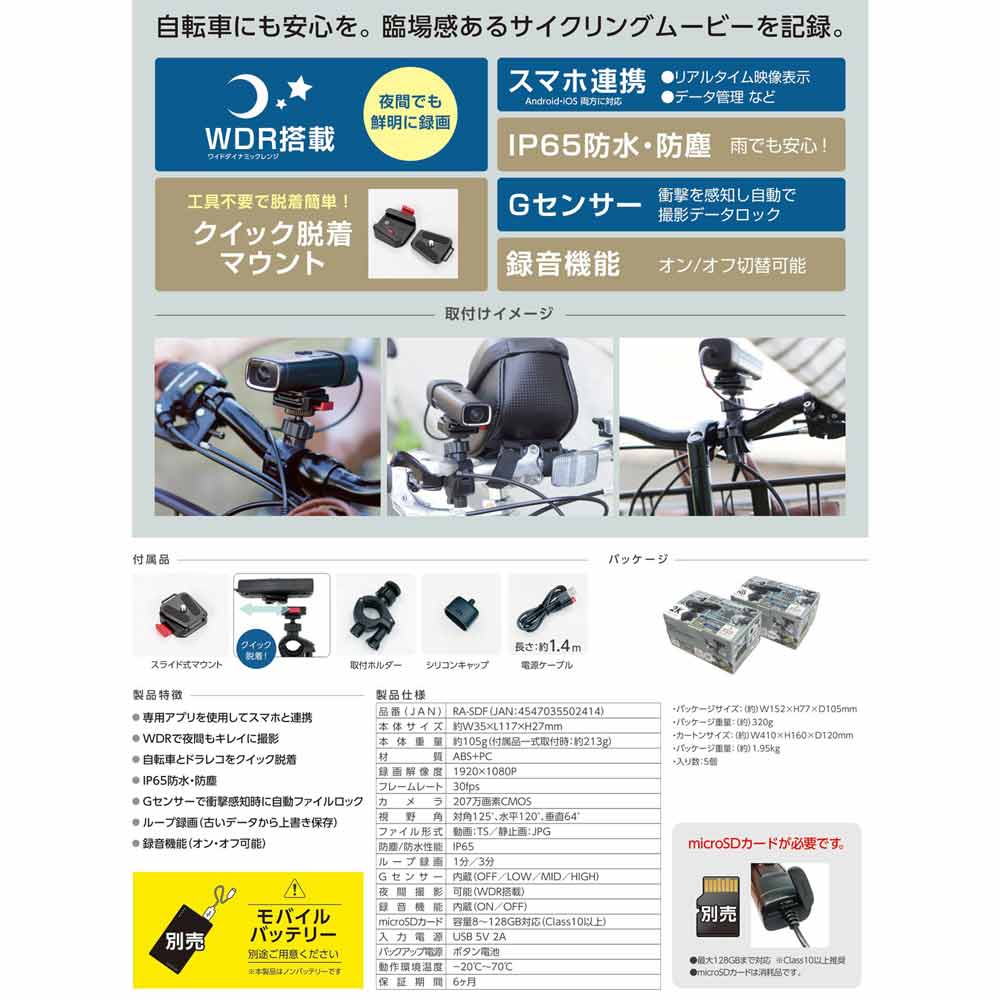 ●スマホと連携する自転車のためのドラレコ ●専用アプリでスマホと連携:リアルタイム映像表示、データ管理など ●WDR搭載:夜間でも鮮明に撮影 ●IP65防水・防塵:雨でも安心して走行可能 ●Gセンサー搭載:衝撃を感知し、自動でファイルをロック ・本体サイズ:約W35×L117×H27mm ・本体重量:105g(付属品一式取付時/約213g) ・材質:ABS+PC ・画像解像度:2560×1440P/1920×1080P/1280×720P ・フレームレート:30fps ・カメラ:368万画素CMOS ・視野角:対角130°、水平120°、垂直64° ・ファイル形式:動画/MP4 静止画/JPG ・防水・防塵性能:IP65 ・ループ録画:1分/3分 ・Gセンサー:内蔵(OFF/LOW/MID/HIGH) ・夜間撮影:可能(WDR搭載) ・録音機能:内蔵(ON/OFF) ・microSDカード:容量8~128GB対応(Class10以上) ・入力電源:USB 5V 2A ・バックアップ電源:スーパーキャパシタ内蔵+ボタン電池 ・動作環境温度:-20C~70C