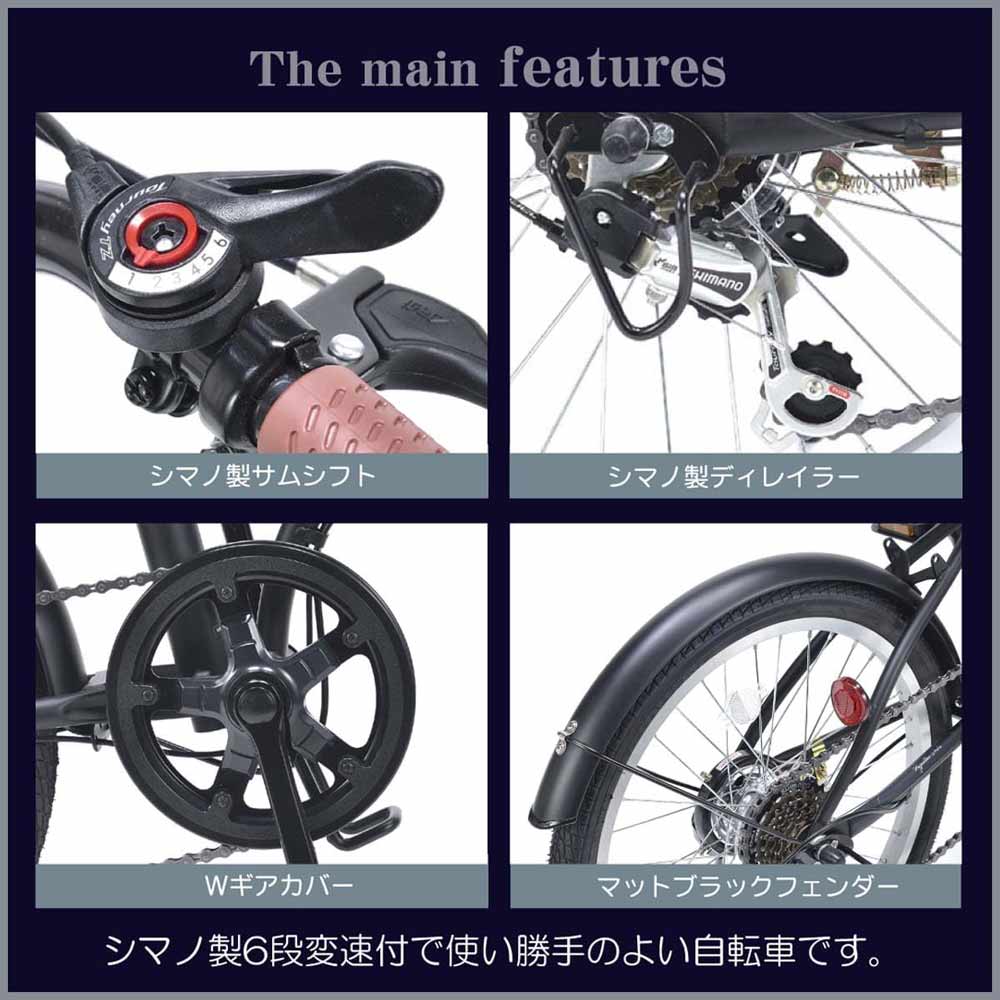 ●自然に溶け込む厳選カラーバリエーション! ●シマノ6段変速機(サムシフト)付で快適走行! ●簡単折畳で収納にも便利! ●サイフに優しいバリュー自転車! 本体サイズ(mm)H950~990×W550×L1460 外箱・折畳サイズ(mm)H590×W350×L840 サドル高さ(mm)680~860 本体重量(N・W)約15.0kg 梱包重量(G・W)約17.5kg 適応身長145cm~ 適応体重75kg以下 JIS耐振動試験合格品 フレーム/スチール リム/アルミ 前輪ブレーキ/キャリパーブレーキ 後輪ブレーキ/バンドブレーキ 変速シフター・ディレイラー/シマノ ハンドル・バー/セミフラットタイプ差込式 備考/折畳ジョイント部二重ロック方式・Wギアカバー・マットブラックフェンダー・ディレイラーガード 他