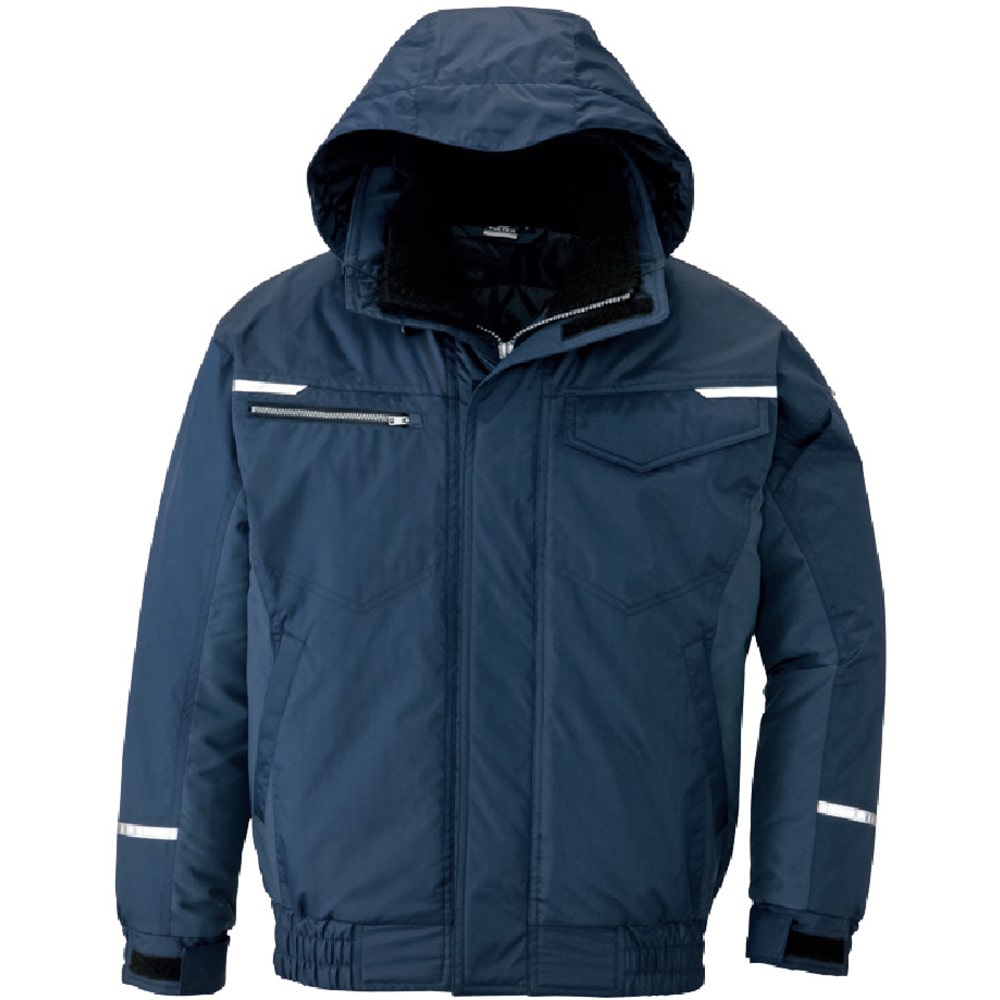 ●制電基準JIS T8118適合品です。●防風機能付きで保温効果があります。●撥水機能付きです。●360度反射材付きで安全性にも配慮しています。●フード取り外し可能です。●色:ネイビー●サイズ:LL●着丈(cm):72●胸囲(cm):135●肩幅(cm):57●袖丈(cm):62●適合胸囲(cm):135●制電防止:JIS T8118適合品 質量780g