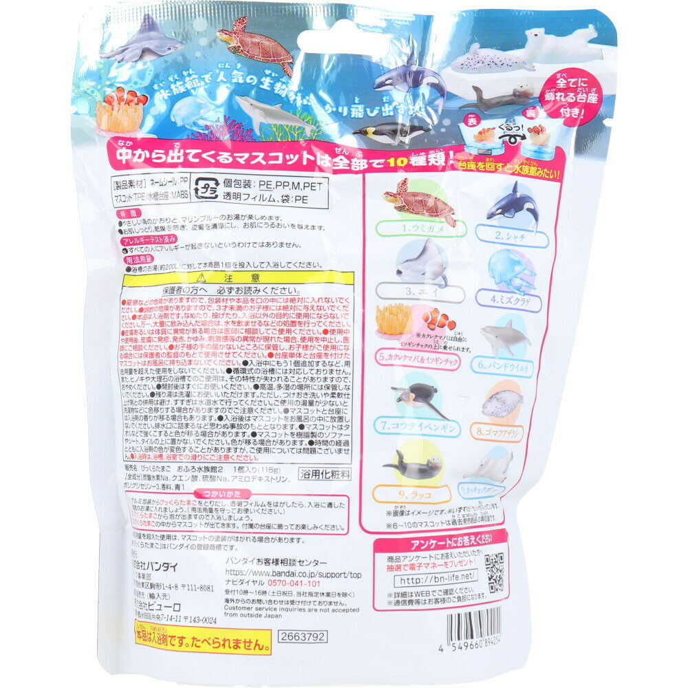 大きな入浴剤が溶けると、水族館の人気者のマスコットが中から1つ出てきます。 (全10種)入浴剤が溶けたお湯はマリンブルーの色とやさしい海の香り。 全長約50mmのマスコットをぷかぷか泳がせて遊んだ後は、専用の水槽台座に飾って楽しめます。