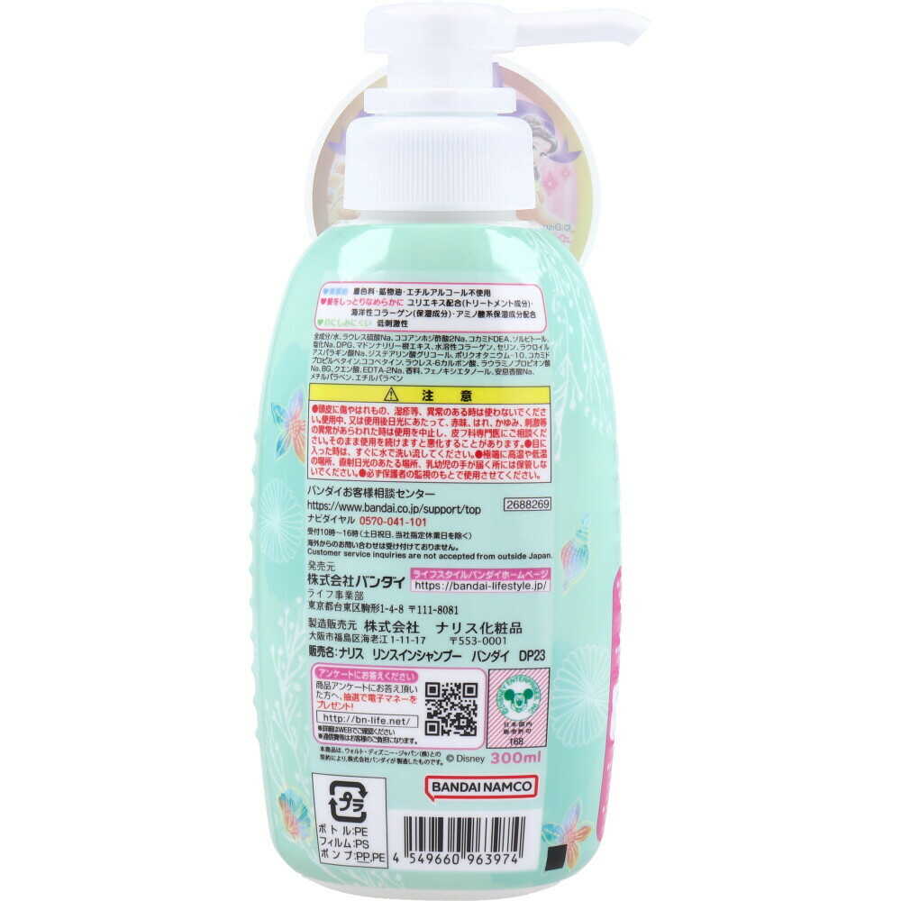 「ディズニープリンセス」のリンスインシャンプー!髪と頭皮をやさしく洗う、目にしみにくい弱酸性のリンスインシャンプーです。 リンスインタイプだから、お子様の髪の毛を簡単に洗えます。 無添加:着色料・鉱物油・エチルアルコール不使用。 アミノ酸系界面活性剤配合で、髪をしっとりなめらかにします。 ユリエキス配合(トリートメント成分)、海洋性コラーゲン(保湿成分)、アミノ酸系保湿成分配合。 本体ラベルデザインは、「アリエル・ベル・ラプンツェルデザイン」・「アリエルデザイン」の全2種類!(選べません。) フレッシュフローラルのかおり。