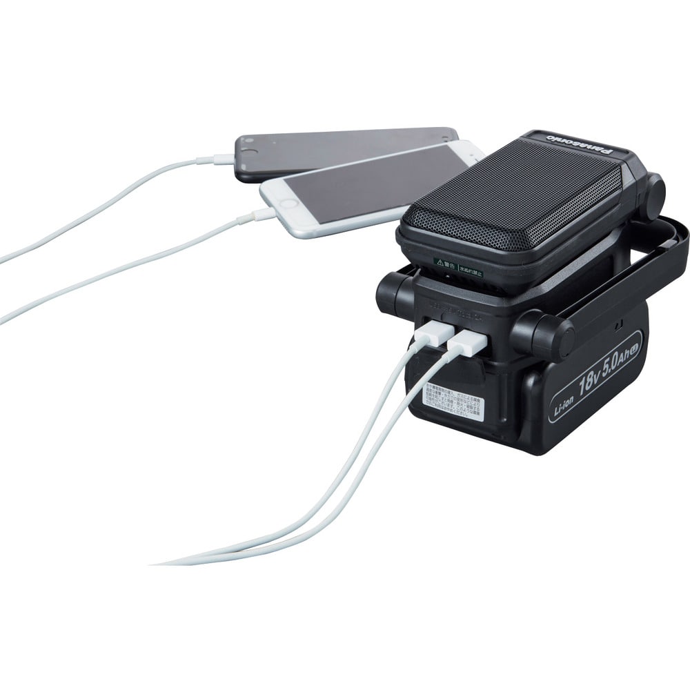 ●クリアで迫力の音楽再生。スマートフォン充電もできて便利です。●持ち運びに便利なハンドル付です。●内臓フックで吊下げも可能です。●停電などの非常時にも便利です。●音楽を聴きながらの充電も可能です。●スピーカー面がフレキシブルに可動します。●幅(mm):162●奥行(mm):70●高さ(mm):90●色:黒●14.4V 18V 21.6Vリチウムイオン電池に対応●充電用USB端子を2口搭載●見通し通信距離:約10m●ペアリング数:8(最大)●対応プロファイル:A2DP AVRCP●Bluetooth:Ver4.2 class2(2.5mW) 質量420g