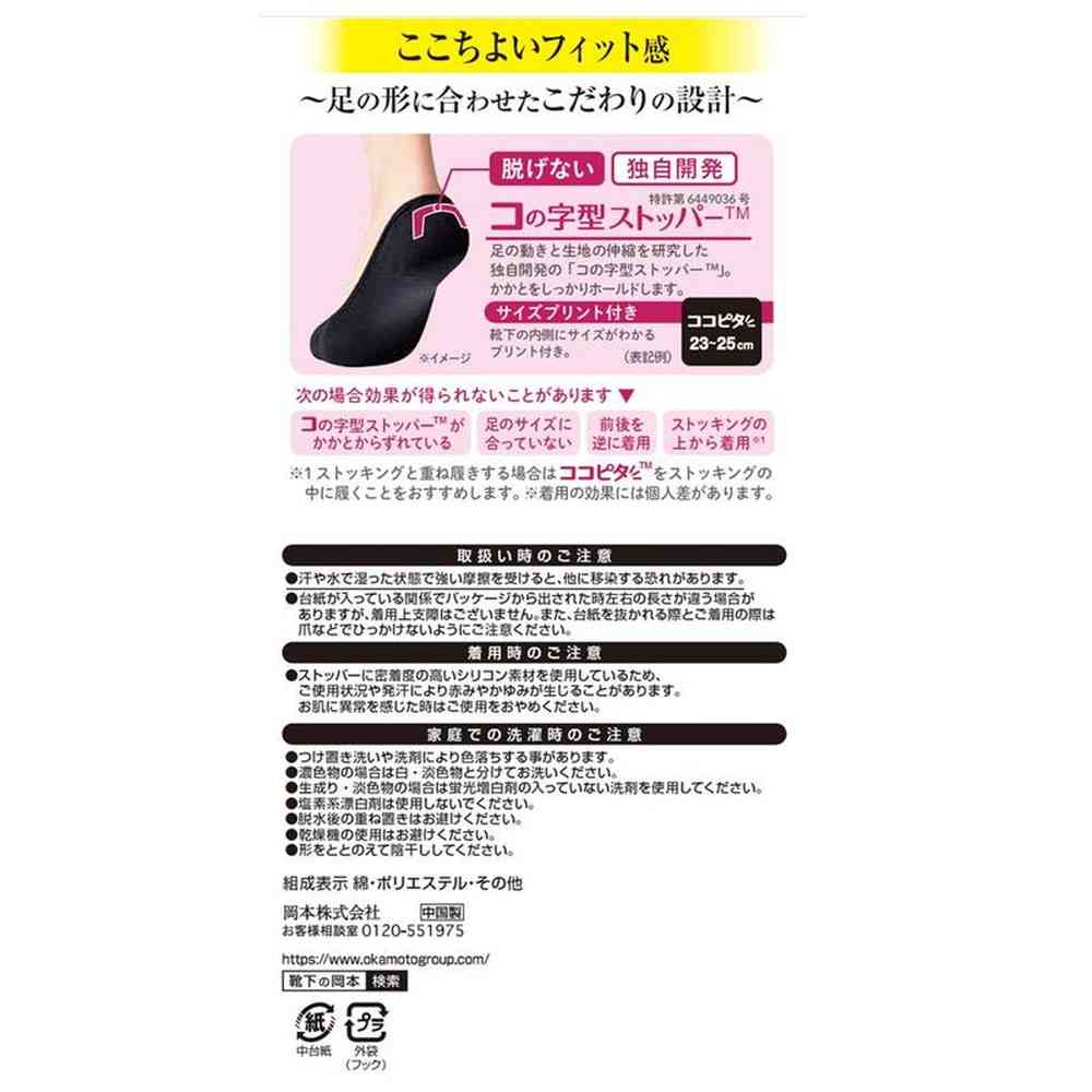 【一日中、脱げない】 足の動きと生地の伸縮を研究した独自開発・特許技術の「コの字型ストッパー?」がかかとをしっかりホールドし、「一日中、脱げない」を実現。階段を上っている時も、走っている時も、靴を脱ぐ時も、脱げません。 【靴から見せない絶妙設計】 靴から靴下が見えないので、足もとをスッキリ見せ、コーディネートの邪魔をしません。 【ココピタの履き方】 コの字型ストッパーがかかとをしっかり包むように履いてください。 かかとの生地が余らずピタッとフィットするようにしてください。