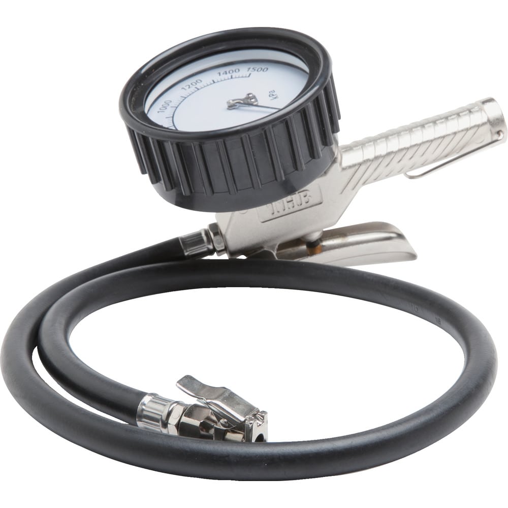 ●タイヤ空気圧の測定・増圧・減圧ができます。●レバーを軽く握ると排気でき、空気を入れすぎた場合も簡単に空気圧を調整できます。●大型ゲージφ89mmで目盛りが見やすいです。●タイヤのバルブにはクリップチャックで接続するので、充填中にチャックを押しあてておく必要がありません。●測定範囲は1400kPaまでと幅広く、バイクからトラック・バスなど大型車まで使用することができます。●測定範囲(kPa):100~1400●最小目盛(kPa):20●全長(mm):1031●幅(mm):100●高さ(mm):135●ゲージ径(mm):φ89●摘要:バイク・乗用車・バン・トラック・バス用●ホース長(mm):850●タイプ:グリップタイプ●ホース長:850mm●ゲージ径:φ89mm●測定単位:20KPa●先端形状:クリップチャック(米式タイプ) 質量900.000g