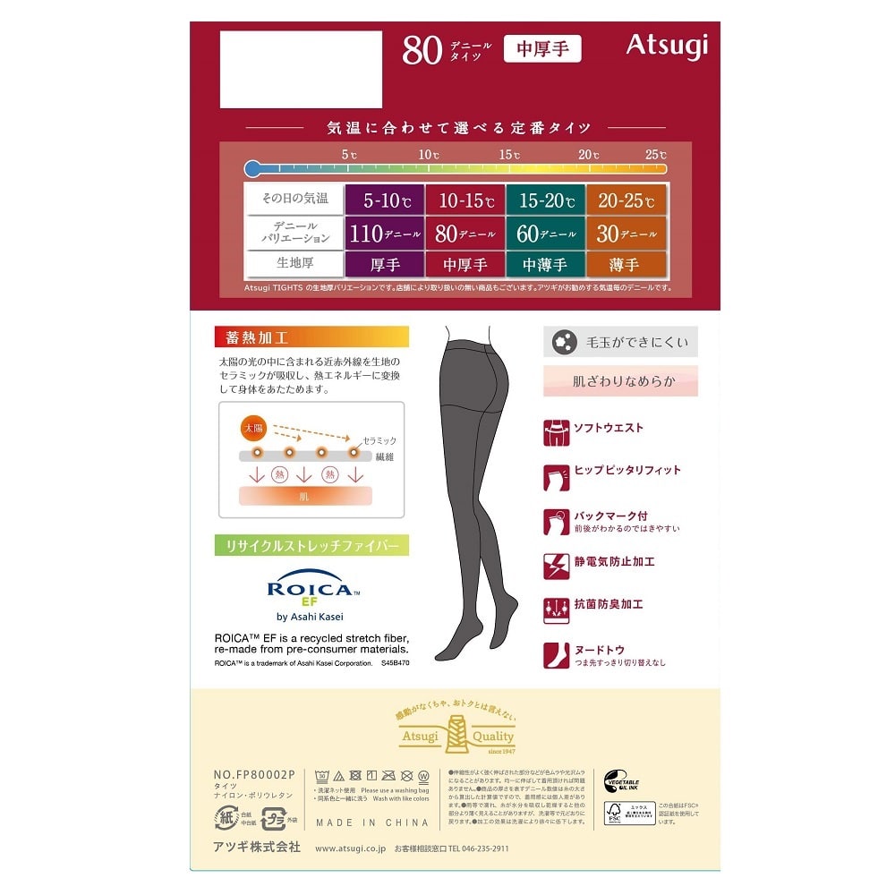 気温に合わせて選べる中厚手タイツ。蓄熱加工。毛玉ができにくく、肌ざわりなめらか。ソフトウエスト。ヒップピッタリフィット。前後がわかるバックマーク付。静電気防止加工。抗菌防臭加工。つま先すっきりヌードトウ。