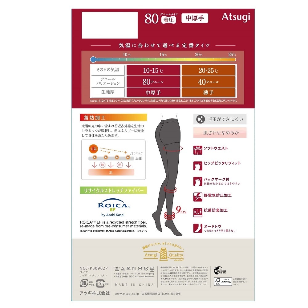 気温に合わせて選べる中厚手着圧タイツ。蓄熱加工。毛玉ができにくく、肌ざわりなめらか。ソフトウエスト。ヒップピッタリフィット。前後がわかるバックマーク付。静電気防止加工。抗菌防臭加工。つま先すっきりヌードトウ。