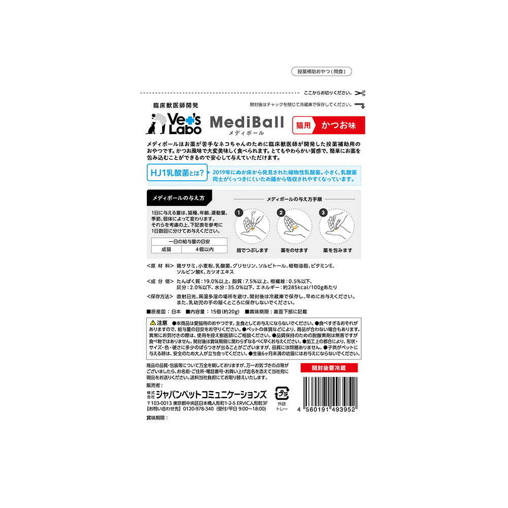 メディボールはお薬が苦手なネコちゃんのために臨床獣医師が開発した投薬補助用のおやつです。 かつお風味で大変美味しく食べられます。 とてもやわらかい質感で、簡単にお薬を包み込むことができるので安心して与えていただけます。