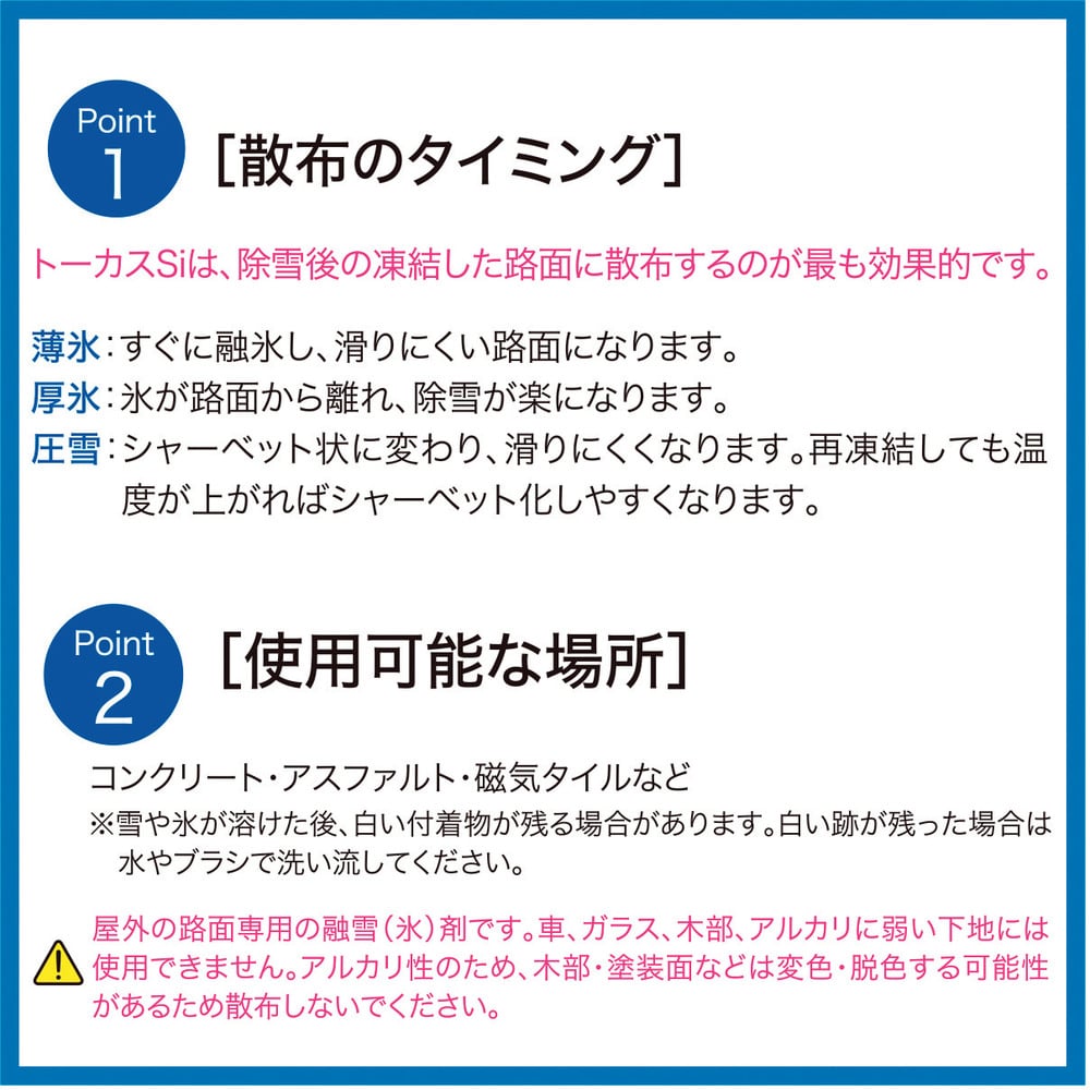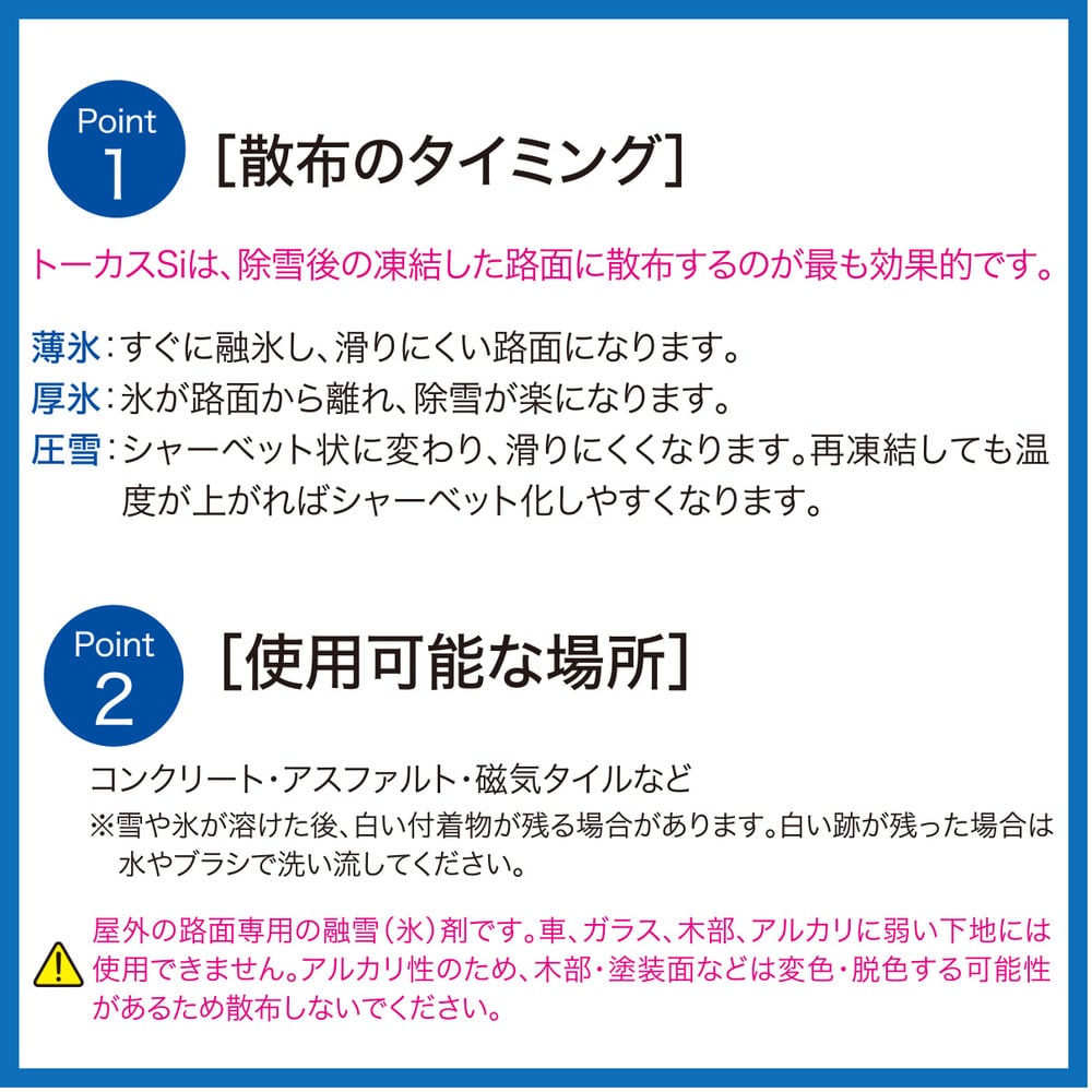 ●他の融雪剤と同時に散布しないでください●-10度以上で使用してください。●-11度以下になると材料が凍結する恐れがあります。