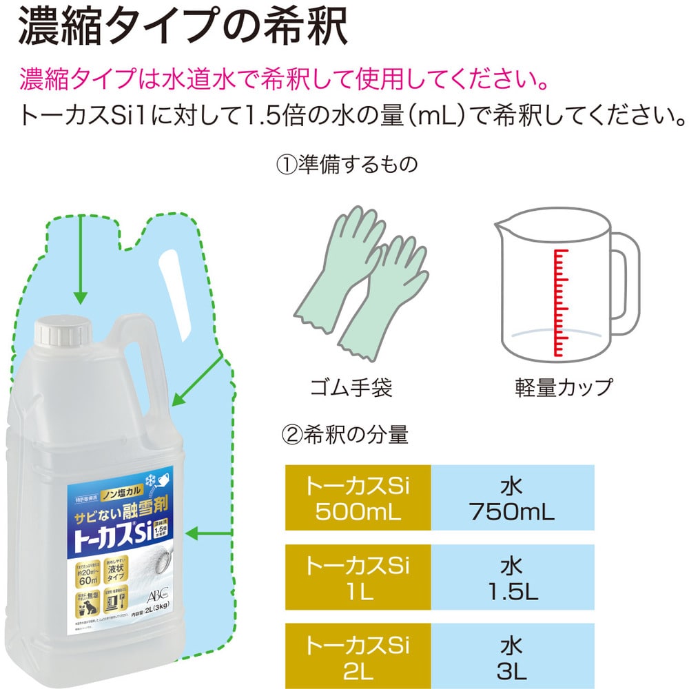 ●除雪後の凍結面または圧雪面にじょうろなどで簡単に散布するだけで滑りにくい路面になります。●非塩素系、環境配慮タイプの融雪(氷)剤で、植物の生育および生物へ悪影響がありません。●液状タイプで即効性に優れています。●金属(鉄・アルミ)を腐食させません。●均一な融雪(氷)効果が得られます。●AMSの規格試験で、環境への安全性が立証されました。●水で希釈して使用するコンパクトタイプです。●コストパフォーマンスに優れた濃縮タイプです。●容量(L):2●容量(kg):3●使用面積の目安:約20~60[[M2]]●散布量の目安(希釈時):凍結面約80ml/[[M2]]~、積雪面約250ml/[[M2]]~ 質量3kg
