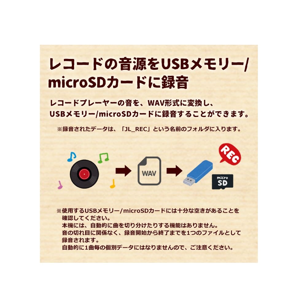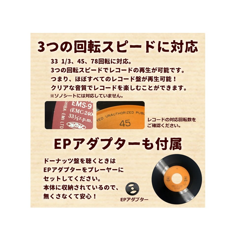 思い出の名盤が蘇る。多機能レコードプレーヤー ●レトロな外観でも、機能は充実。気軽に聴けるのでレコードデビューにピッタリ!●レトロなトランクケース型で部屋の隅に置いても、オシャレな雰囲気に。●使わない時はフタを閉めておけば、埃も入りません。●持ち運び簡単。部屋の移動もらくらく●331/3、45、78回転に対応。クリアな音質でレコードを楽しむことができます。●EPアダプターも付属●最後の曲が終了すると自動でターンテーブルの回転がストップする、オートストップ機能搭載●USBメモリー/microSDカードから再生/録音可能●Bluetooth接続可能●FMアンテナ付き 【仕様】 ●寸法:360×125(開いた時:320)×260mm●質量:3kg●コード長さ:150cm●FMアンテナ長さ:130cm●消費電力:5W●入力端子:AUX-IN(3.5mm径ミニプラグ)、AC/DCアダプター接続端子、USB/microSDカード端子●出力端子:RCA端子(右:赤、左:白)●ヘッドホン端子(3.5mm径ミニプラグ)●付属品:EPアダプター、AC/DCアダプター(本機専用)、取扱説明書