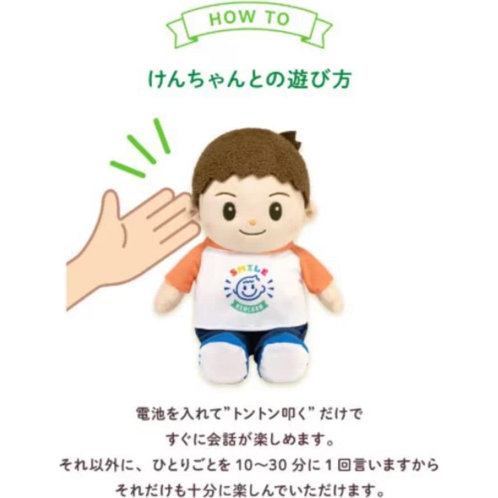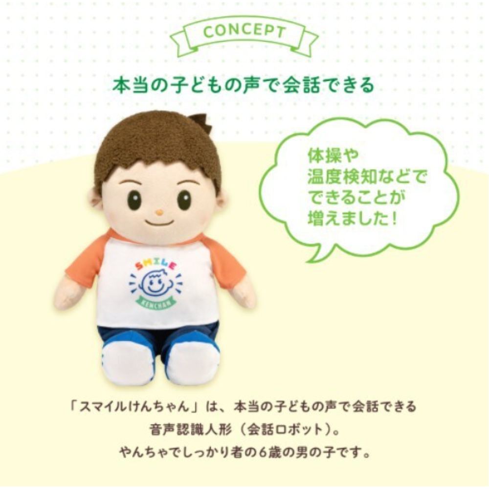 おしゃべりけんちゃんが「スマイルけんちゃん」にリニューアル!愛らしいおしゃべりやハイスペックの機能はそのままに、かわいい笑顔に大変身!おしゃべりいっぱい、元気で優しい6歳の男の子「けんちゃん」は、28種類の認識ワード、2000のおしゃべりワードを搭載し、本物の6歳の男の子の声で話すおしゃべり人形です。「なぞなぞ」や「けんちゃん体操」などがお楽しみいただけます。夫婦の会話が減った、一人で過ごす時間が多く、人と話す機会が少ない、最近物忘れが増えた気がする、離れて暮らす父や母のことが気になる、特別プレゼントを探している・・・そんな方におすすめです。
