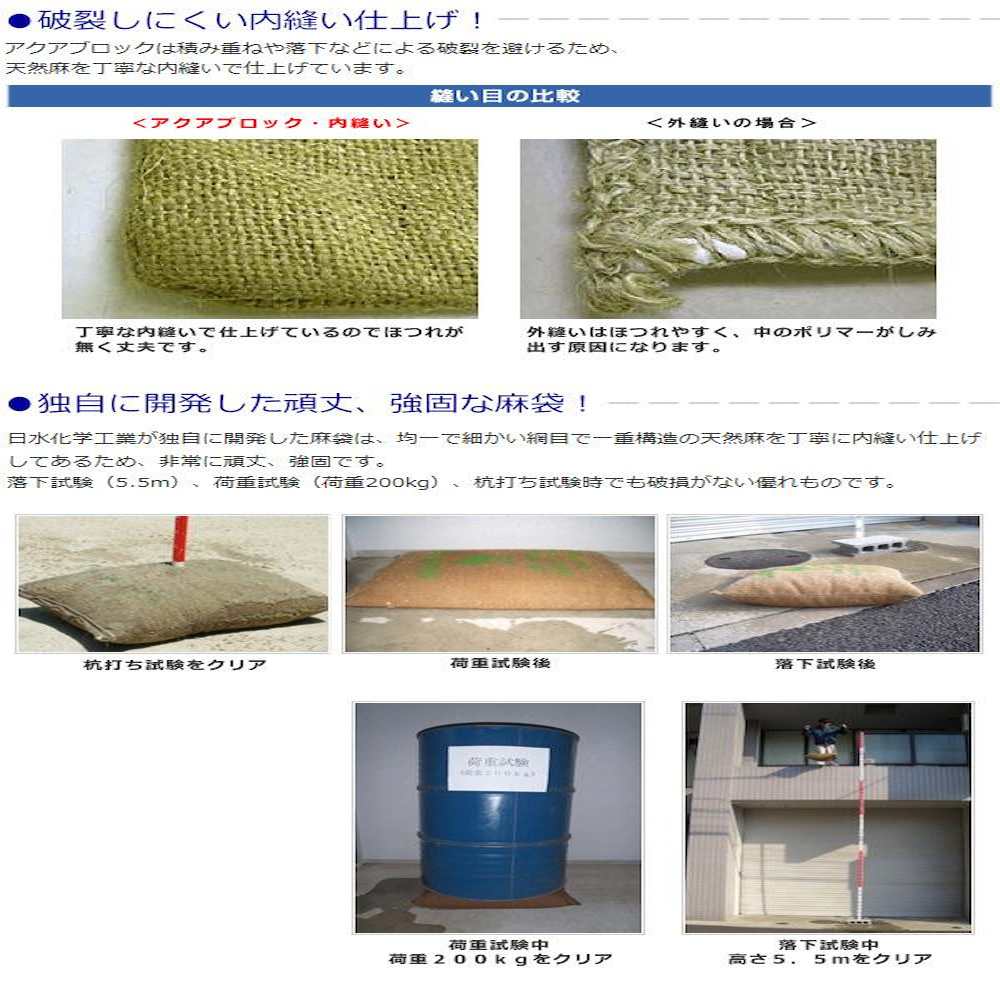 防災用品吸水性土のう 「アクアブロック」 NXシリーズ 水だけでふくらむ土を使わない緊急簡易吸水性土嚢!!真水対応の再利用可能な吸水性土のうです。紫外線に強く、劣化の少ない高品質の高吸水性ポリマーを使用することで、再利用を可能としました。屋外で陰干しすると、再利用することができます。保管に場所もとりません。