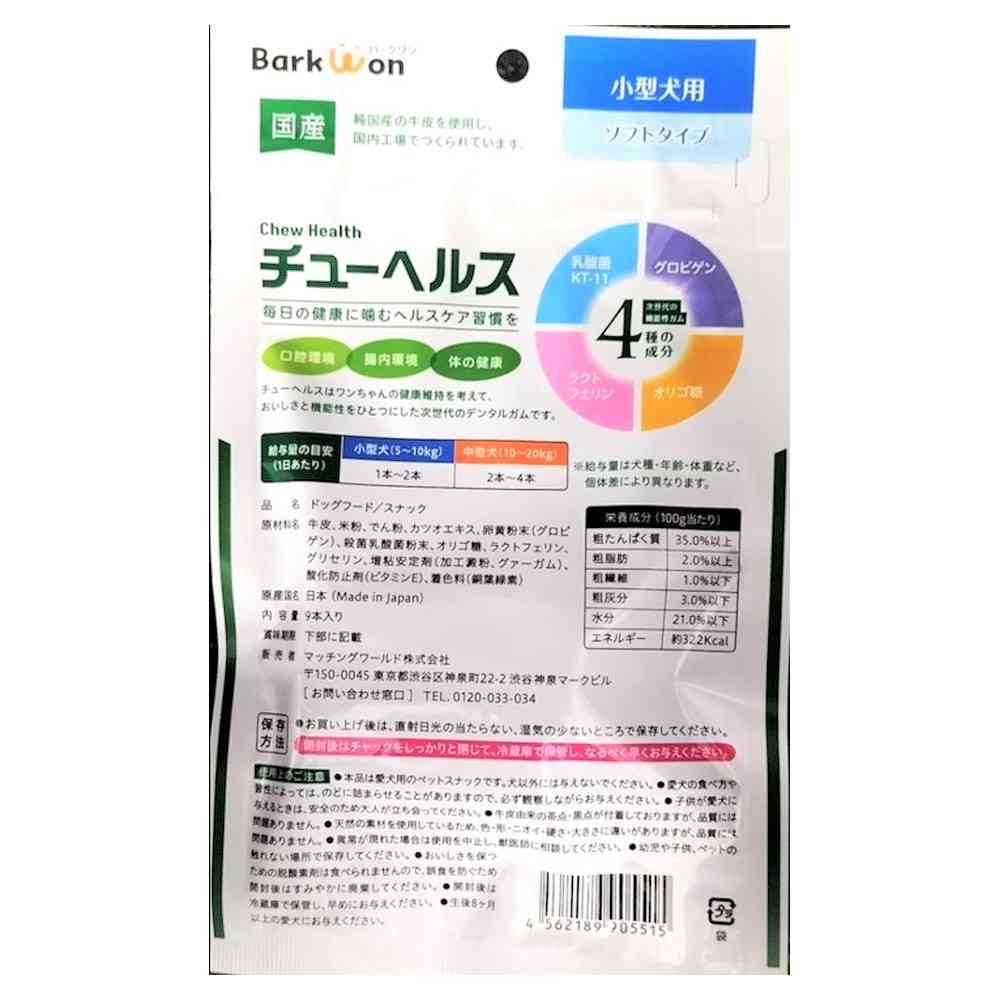牛皮、米粉、でん粉、かつおエキス、卵黄粉末(グロビゲン)、殺菌乳酸菌粉末、オリゴ糖、ラクトフェリン、グリセリン、増粘安定剤(加工澱粉、増粘多糖類)、酸化防止剤(ビタミンE)、着色料(銅葉緑素)
