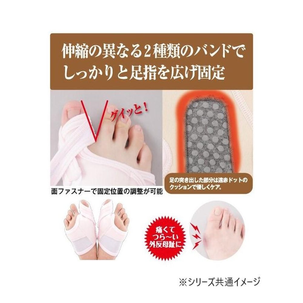外反母趾サポーター。伸縮の異なる2本のバンドで足指広げて固定します。 【使用上の注意】 ※2本のテープを指の根元近くで巻くと痛みを感じる場合がございますので、できるだけ真ん中より上部分に巻きつけるようにしてご使用ください。※あまりきつく巻きつけると、うっ血する可能性がございますのでご注意ください。※糖尿病や血行障害などの方は専門医にご相談のうえでご使用ください。※乳幼児の手の届かないところに保管してください。※使用時にうっ血や痛み、痒みなどの異常を感じられた場合は使用をおやめください。※過度に力をかけた場合、テープ部分などにほつれなどが生じる場合がございますのでおやめください。※湿疹、あせも、傷などがある場合は使用しないでください。肌の弱い方は短期間の使用で様子をみてください。※洗濯は、液温を30度とし、弱い手洗いをしてください。乾燥機、アイロン、塩素系漂白剤は絶対に使用しないでください。
