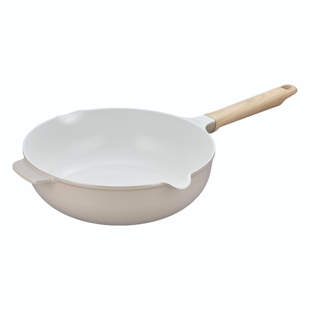 ダイキャスト製法だから軽量!見た目も機能性もこだわったフライパン 高耐久性セラプロテクトコート採用 ダイキャスト製法でIH対応でも軽量 内面が白くて、食材の色等を確認しやすい 留め具がないから洗いやすい 優しい色味の木目調ハンドル 卵2つでちょうどよいサイズ感