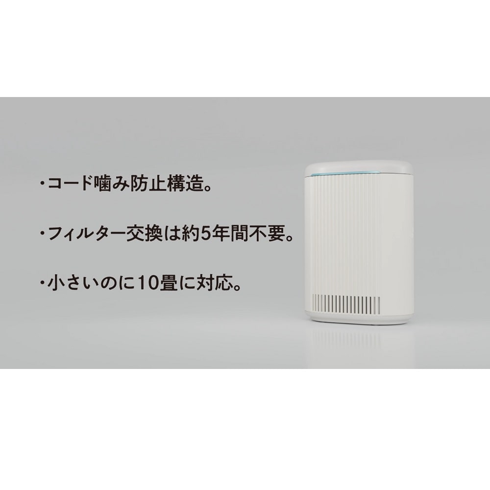 猫のトイレ臭を徹底除去。猫想いの脱臭除菌機 ●猫の糞尿臭に含まれる成分「3-MMB」や「アンモニア」等を光除菌技術で徹底除去。●トイレ横に置くだけで、ツンとした臭いを強力に除去し、いつも清潔な空間に。●猫想い4つの特徴。1:猫にやさしい「光除菌方式」。猫への影響にも配慮した、化学物質を放出しない方式です。2:驚かせない静音設計。モーターの回転をゆるやかに上げ、音に敏感な猫もリラックス。3:噛みに強い電源コード。丈夫なPVC編み込み仕様で、断線リスクを軽減。4:猫が落ち着くグレーカラー。●猫トイレのそばにも置けるコンパクトサイズなのに、室内臭も10畳までしっかり脱臭。●5年間フィルター交換不要。光除菌フィルター+脱臭フィルターで脱臭力長持ち。 【仕様】 ●製品寸法:W206×D140×H289mm●重量:約1.6kg●推奨床面積:約10畳●消費電力:弱/11W、標準/11.5W、ターボ/18W●運転音:弱/21dB、標準/25dB、ターボ/48dB●風量:弱/0.10m3/min、標準/0.24m3/min、ターボ/0.70m3/min●コード:約1.5m●付属品:ACアダプター