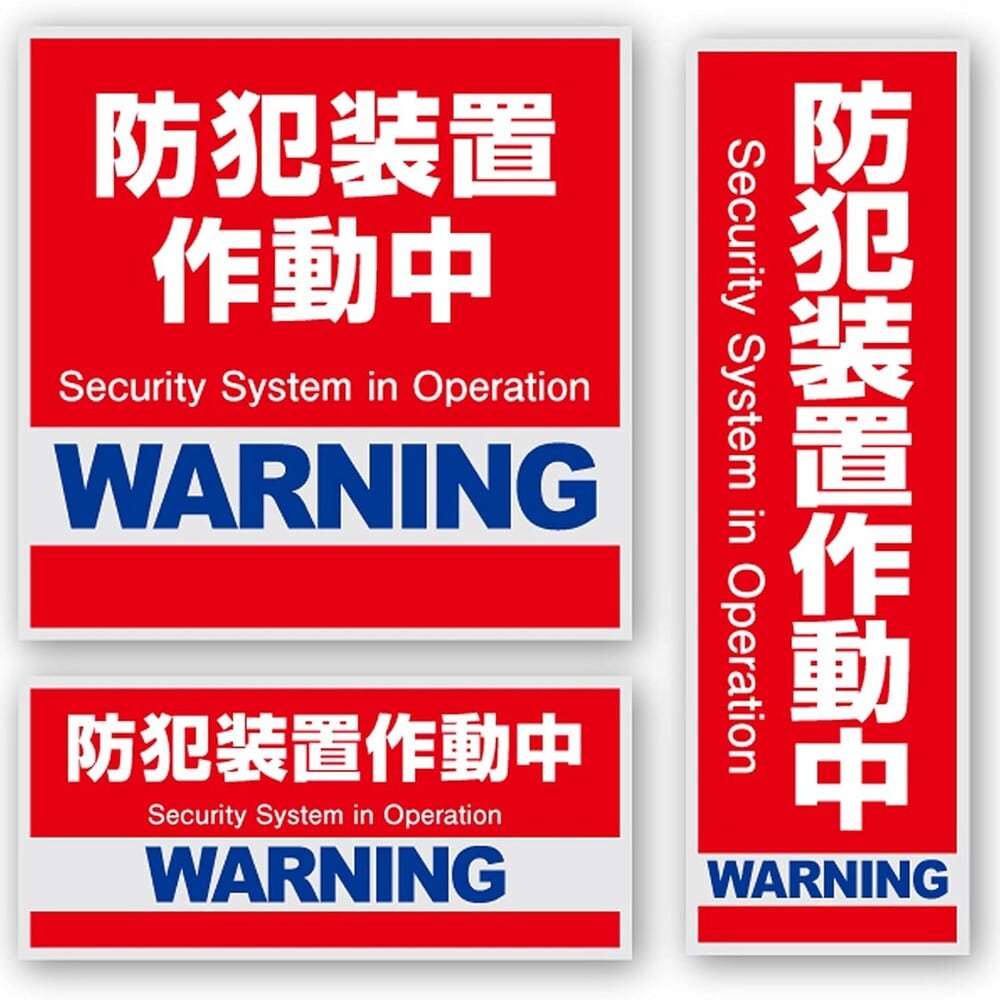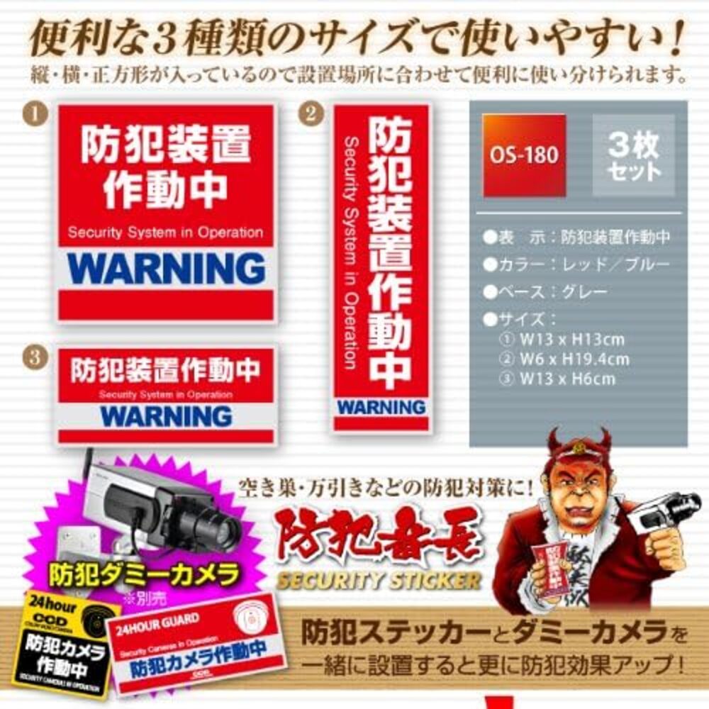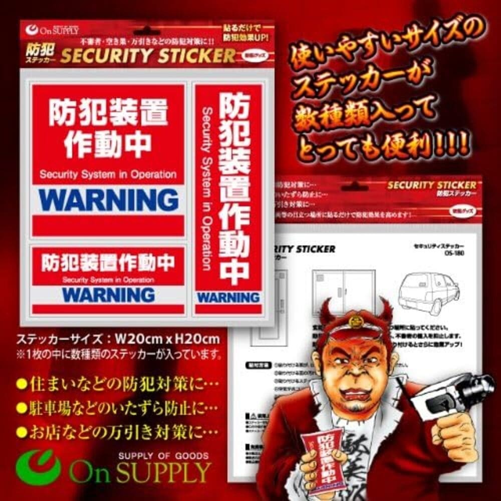 ●セキュリティーステッカーの利点・効果 1)低コストでだれでも貼れる簡単シール 2)防犯意識の高さをアピール、必然的に防犯効果が高まります。 3)防犯装置が設置されていなくても侵入者の威嚇効果があります。 4)防犯装置を実際に設置されている場所では、更なる意欲撃退効果。 5)防犯ダミーカメラ等と一緒にご使用されると更に効果的です。