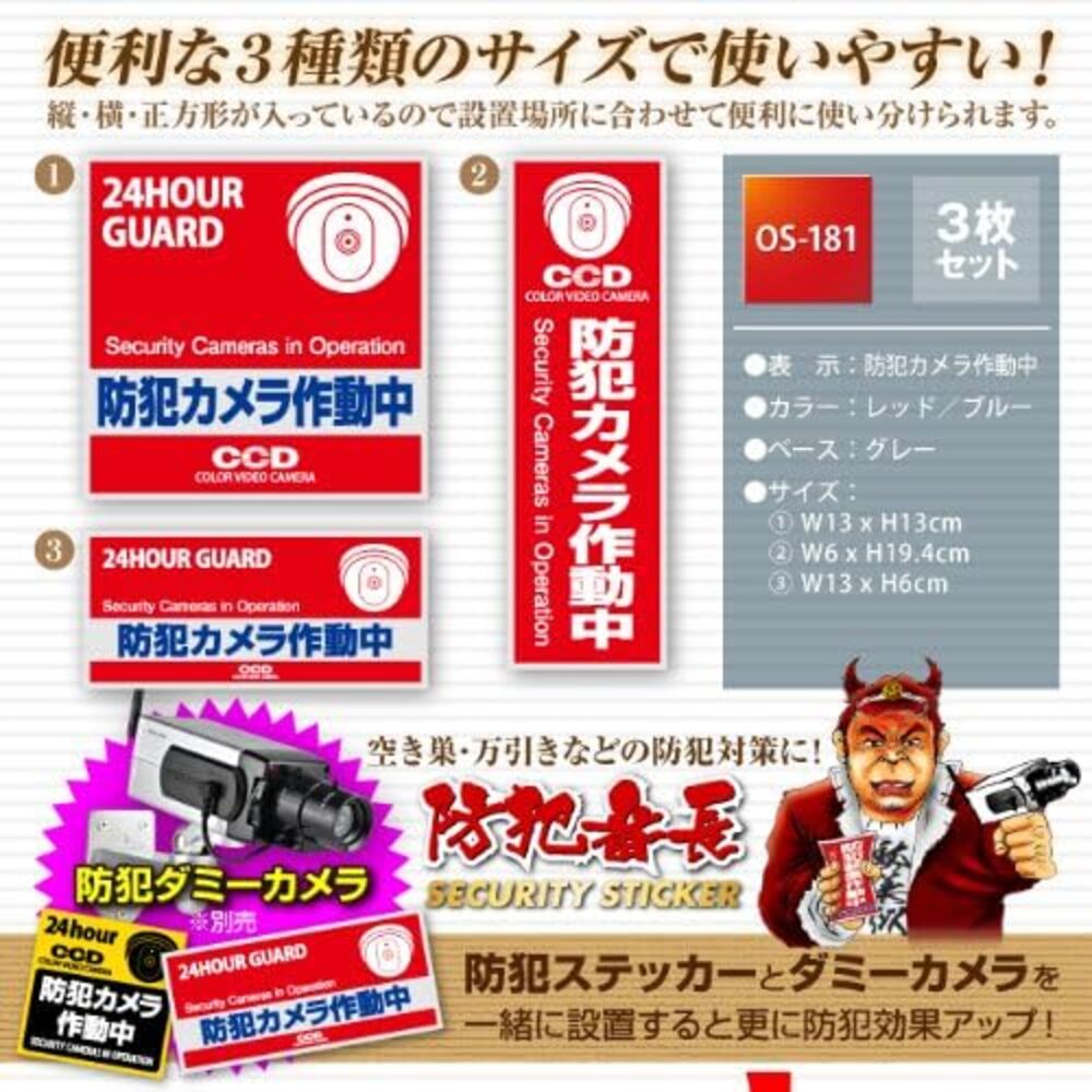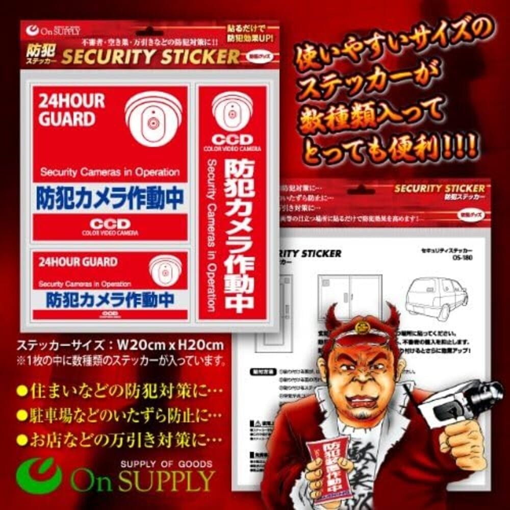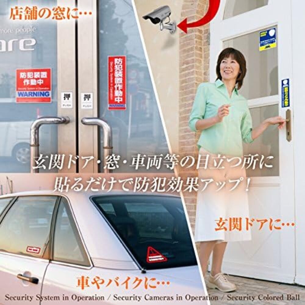 ●セキュリティーステッカーの利点・効果 1)低コストでだれでも貼れる簡単シール 2)防犯意識の高さをアピール、必然的に防犯効果が高まります。 3)防犯装置が設置されていなくても侵入者の威嚇効果があります。 4)防犯装置を実際に設置されている場所では、更なる意欲撃退効果。 5)防犯ダミーカメラ等と一緒にご使用されると更に効果的です。