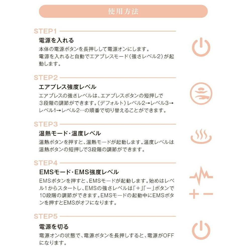 本商品は、治療目的とした マッサージ 器/医療機器ではありません。 次のような医用電気機器と併用しないようお気をつけください。 ●ペースメーカーなどの体内植込み型医用電気機器 ●人工心肺などの生命維持用医用電気機器 ●心電計などの装着型医用電気機器 次のような方はご使用をお控えください。 ●悪性腫瘍のある方 ●心臓疾患のある方、血栓のある方 ●血行障害、毛細血管拡張、血圧に異常のある方 ●薬を服用中の方(医師にご相談の上ご使用下さい) ●糖尿病による合併症などで高度な末梢循環障害による知覚障害のある方 ●肌に傷や湿疹、はれものなど異常のある方 ●安静を必要とする方、四肢の不自由な方 ●発熱している方 ●体調不良、身体に異常を感じている方 ●骨折、骨粗しょう症、ねんざ、肉離れなどの急性疾患のある方 ●背骨に異常のある方、背骨が曲がっている方 ●医療機関で治療中の方(医師にご相談の上ご使用下さい) ●かつて治療や手術を受けたところ、または疾患部へ使用する方 ●体力が極端に衰えた高齢者の方 ●自ら意思表示ができない方や操作が行えない方 ●神経障害、皮膚知覚障害、アレルギー体質、皮膚病、及びアトピー性皮膚炎の方、敏感肌の方 ●医師から 、各種マッサージおよびマッサージャー・マッサージ機・マッサージ器・マッサージガンの使用を禁じられている方