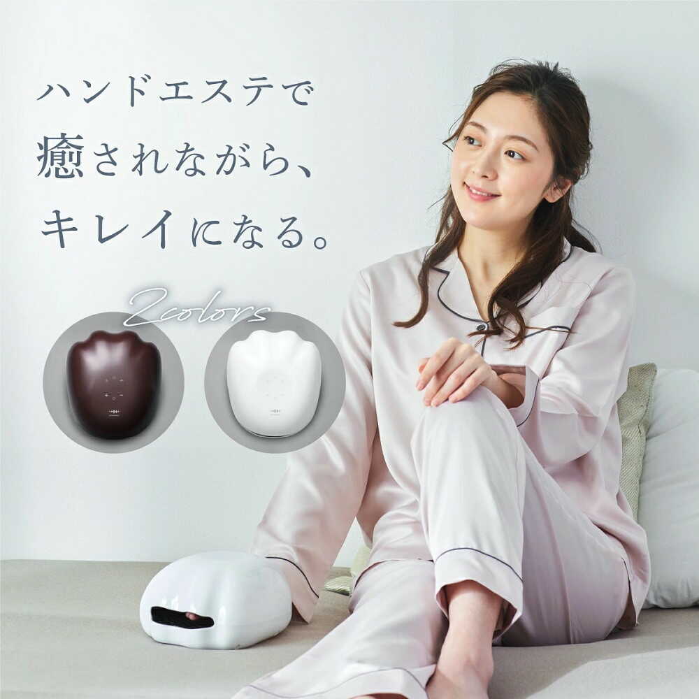 可愛らしいアニマル柄に気持ち癒される「EMS Hand Esthe」。 EMS×温熱×エアプレスで手全体を包み込んでほぐしてくれるだけでなく、年齢の出やすいハンドへのお手軽な美容ケアとしても。 手の深くまで伝わる低周波のリズムに、短時間のケアでも心身ともにリフレッシュできる『EMS機能』(10段階の強度レベルあり)。 手の甲の中心部分を起点に低周波の刺激が先端まで走り、指ケアにも。自信みなぎる艶感ハンドへ導きます。 3段階の温熱レベルからお好みで選べ、ハンドクリームを塗り密閉した状態で温めると潤いがキープされ、しっとりとした手元になります。 まるで人の手でもみほぐすような感覚の『エアプレス機能』は、上下からエアバッグに包まれ、やみつきの心地よさ。 エアバッグを膨らませたりしぼませたりすることで加圧し、手のひらや裏、全体を順番にしっかりと押していきます。 持ち運びに便利なコードレス、安心して使える自動タイマー機能、お掃除しやすいナイロン仕様、肉球デザインストッパーなど使うほどに愛着が沸くディテールも! どなたでもフィットするサイズ感に、男性女性関係なく、安心してお使いいただけます。