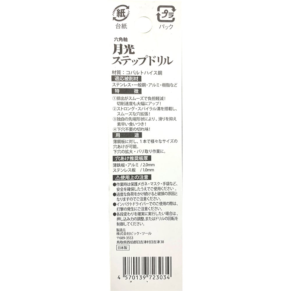 月光シリーズのステップドリル誕生、独自の先端形状とスパイラル設計により、ブレなく食いつき、下穴不要で、素早い切削を実現しました。 ステンレス、一般鋼、アルミ、樹脂など薄板への穴あけや穴拡張に。 月光独自の先端形状でブレなく食いつき、下穴不要です。 月光スパイラル設計によりスムーズな排出・素早い切削を実現します。 ●材質:コバルトハイス。 ●シャンク:六角軸。 ●穴あけ可能サイズ:4~13mm。 ●段数:10段。 ●穴あけ推奨鋼板:ステンレス1mm/一般鋼2mm。