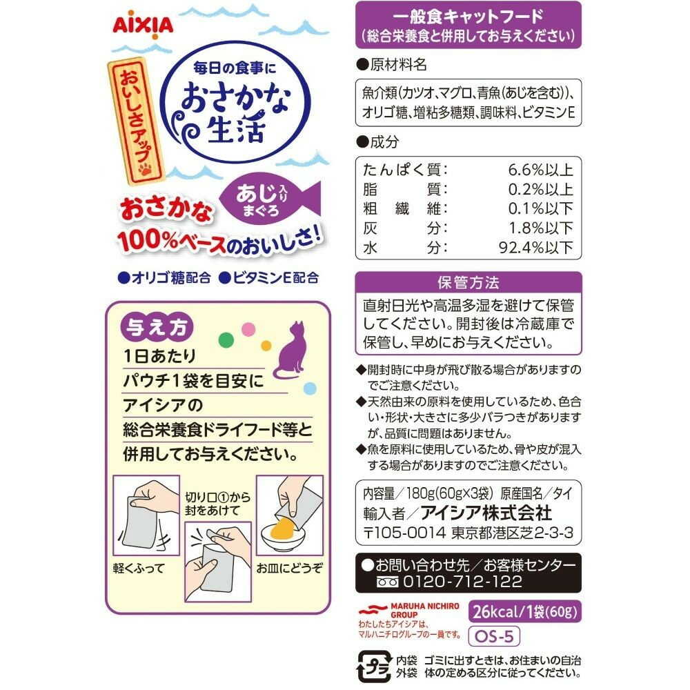●袋のフチや切り口で手を切らないようにご注意ください。 ●開封時に中身が飛び散る場合がありますのでご注意ください。 ●1日あたりパウチ1袋を目安にアイシアの総合栄養食ドライフード等と併用してお与えください。