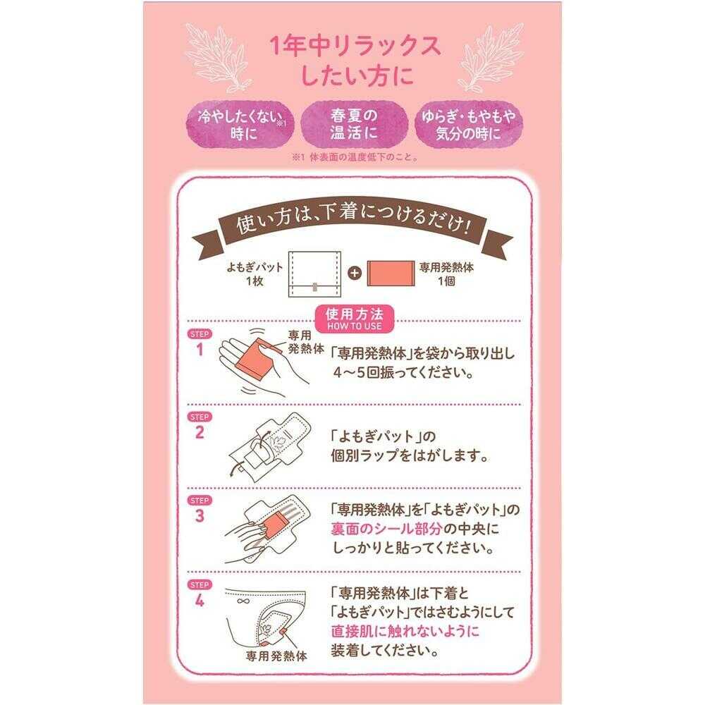 女性の冷えにじんわり届く。韓国の美容健康法「よもぎ蒸し」から着想を得た下腹部や骨盤周りを温めるナプキン型の温熱パット。 下着に貼るだけで簡単に使えます。 おだやかな温感で1年中使いやすい。 やさしく温めタイプ。