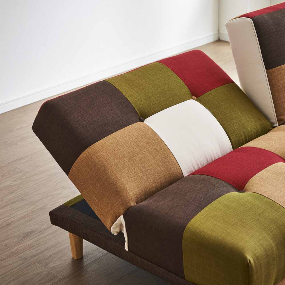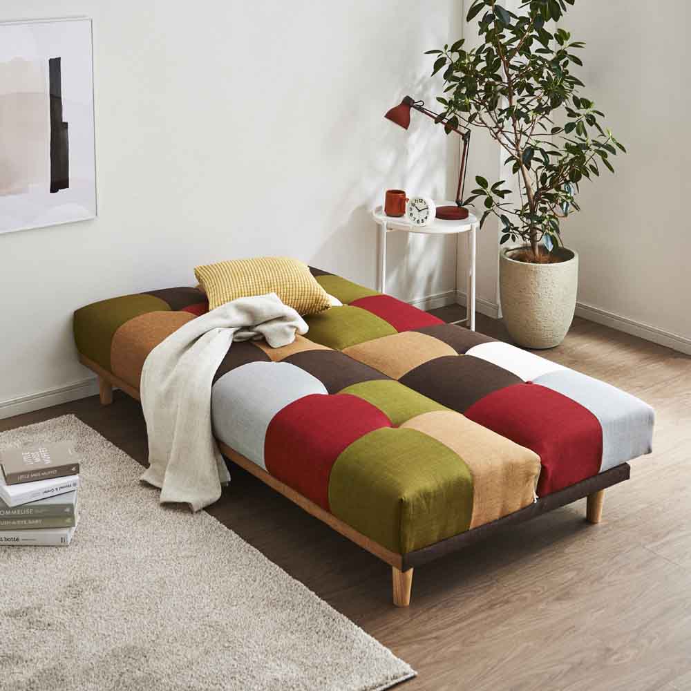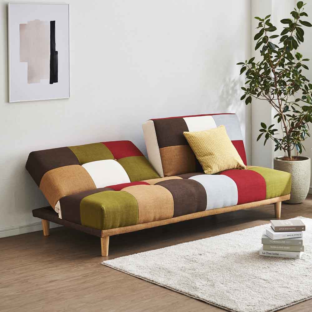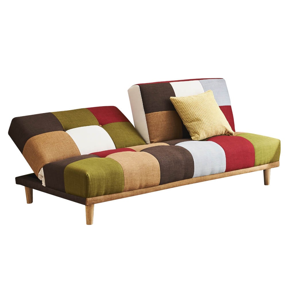 ●お部屋の雰囲気が明るくなるパッチワークソファーベッド。●2WAYタイプなので2人で座る際、お好みの角度で調整可能。●背もたれリクライニングは3段階ギアを採用。●座面高:36cm。●脚高:14cm。●ベッド時サイズ:幅100×長180×高36cm。●カラー:カラフル色。●生産国:中国。