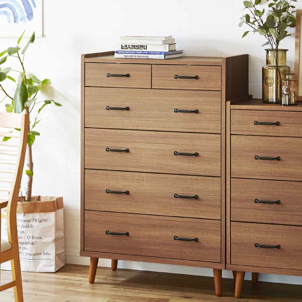 ●北欧風のオシャレな幅80cmのハイチェスト。●家具の産地【大川市】にて生産。●引出し(大)はレール付きで開閉も楽々。●脚付きなのでお掃除も楽々。●脚高:14cm。●引出し(大)内寸:幅71×奥33.5×高14cm。●引出し(小)内寸:幅34×奥33.5×高10cm。●カラー:ウォールナット色。●生産国:日本。