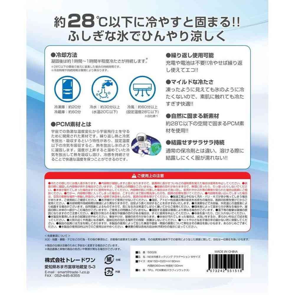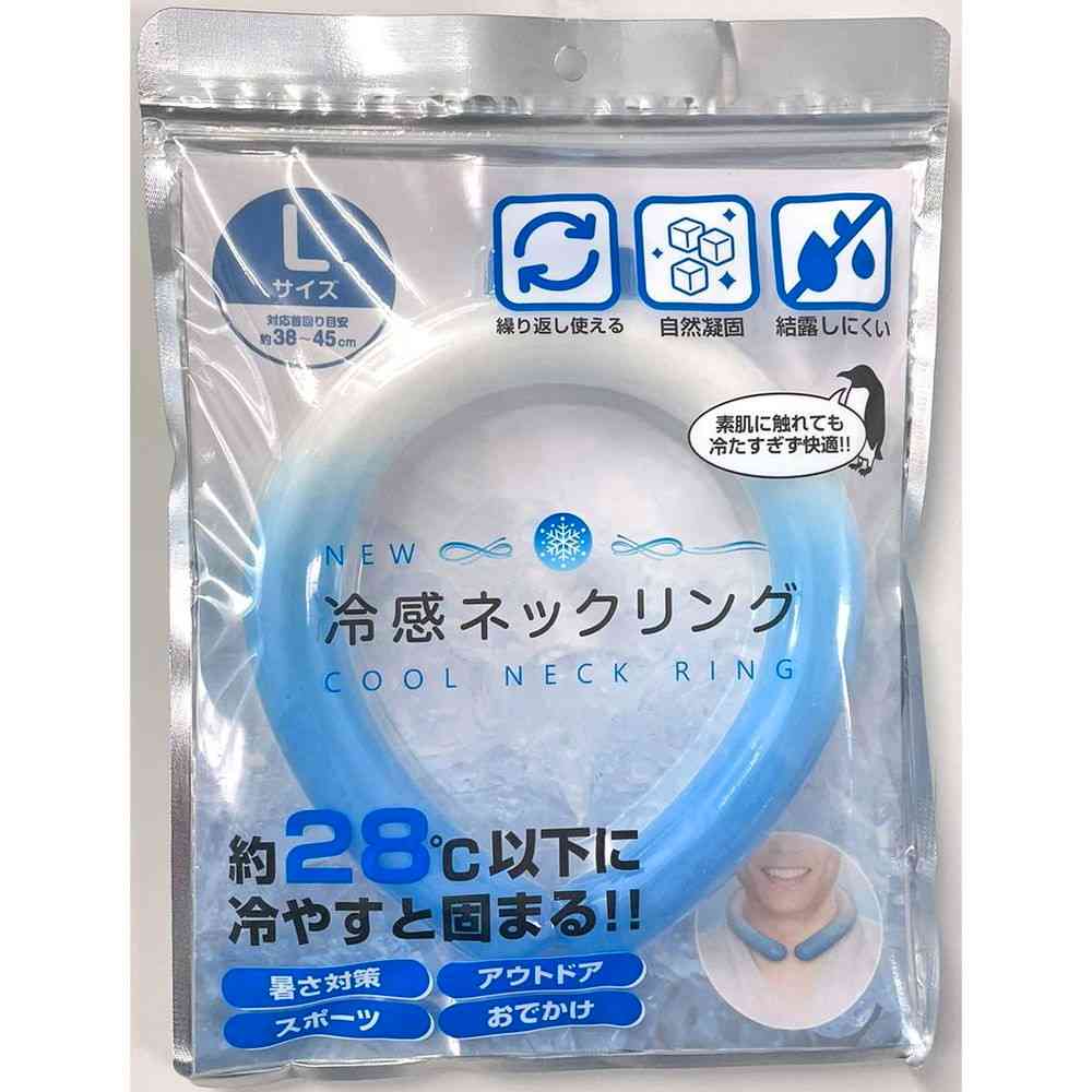 繰り返し熱と冷気を放出・吸収するという特殊な素材で冷感力長持ちのネッククールリング! Lサイズは首回り約38~45cmに対応しています。 男女兼用です。 おウチ、アウトドア、就寝時、通勤時、スポーツ等…様々なシーンの暑さ対策に繰り返し使えます。 充電や電池は不要!冷やせば繰り返し使えてエコです。 【マイルドな冷たさ】凝固後は1時間ほど冷却力が持続します。凍ったように見えても氷のように冷たすぎないので素肌に触れても快適です。 【自然に固まる新素材】約28度以下の空間で固まるPMC素材を使用。繰り返し熱と冷気を放出・吸収するという特性を持ち、冷感を持続させる事が可能で快適な温度を保ちます。 【結露せずさらさら持続】通常の保冷剤とは違い、溶ける際に結露しにくいので服が濡れません。 ●冷却方法:凝固後は約1時間~1時間半程度冷たさが持続します。(自社調べ) ※28℃以下の環境で首元に装着した場合の持続時間です。 ※冷却時間や持続時間は環境により異なります。冷凍庫:約20分、冷蔵庫:約60分、冷水:約30分以上(水温20℃以下)、冷風:約60分以上(設定温度28℃以下)