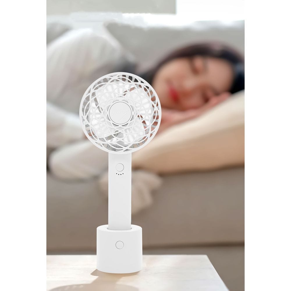 自動回転&置くだけ充電台座付きで、手持ちでも卓上でも快適な送風!風量を4段階で調節できます。90度の自動回転&置くだけ充電台スタンド付(常時給電式)でハンディとしても、卓上でも使えます。連続使用時間は約8時間(弱風)。ファンガードを外して羽根のお手入れが可能なので清潔にお使いいただけます。【仕様】付属品: 充電用USBケーブル(Type-C)、自動回転&充電スタンド●リチウムイオン電池/1800mAh●充電約3.5時間