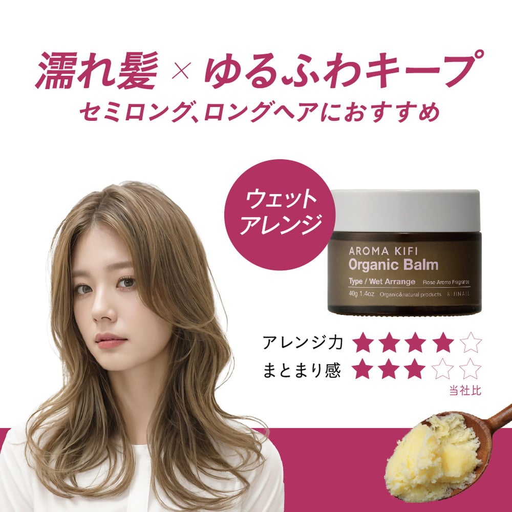 ・世界統一基準である「コスモス認証」に則った、全身使える(主にリップ・ひじ・ひざなど)オーガニック濡れ髪ヘアスタイリング。 (成分&香料が天然由来100%) ・スタイリングしながらダメージ補修。 ・アレンジタイプ:ゆるふわキープ、ミディアム~ロングの方用、ローズアロマの香り。