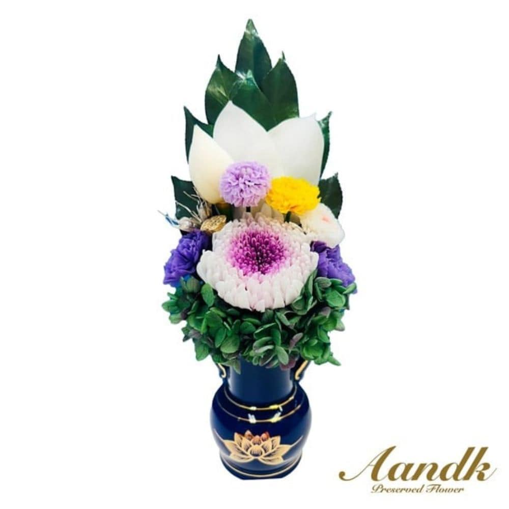 生花由来の仏花のプリザーブドフラワーです。椿葉、輪菊、小菊、ハスの蕾、アジサイなどを使用。造花は使用せず花材はすべて天然素材を使用しているため、仏様にためらうことなくお供えでき安心して飾ることができます。水やり・交換不要でとっても経済的。※花器は付属しておりません。特殊加工することで長期間水やり不要で飾れます。目安として約1年程度お使いいただけます。(使用環境による)造花に抵抗があっても、この商品は生花なので安心してお供えできます。ひとつひとつ丁寧に手作りで作っております。機械的ではないので、生花と同じように少しづつ違いがあります。お手入れの際には柔らかい乾いた布などでホコリを落とす程度にしてください。